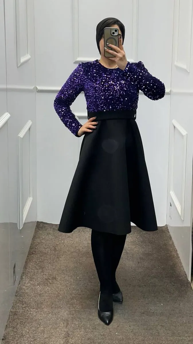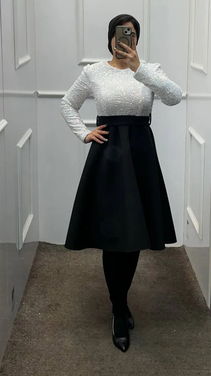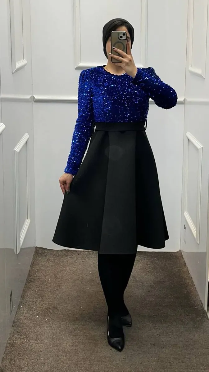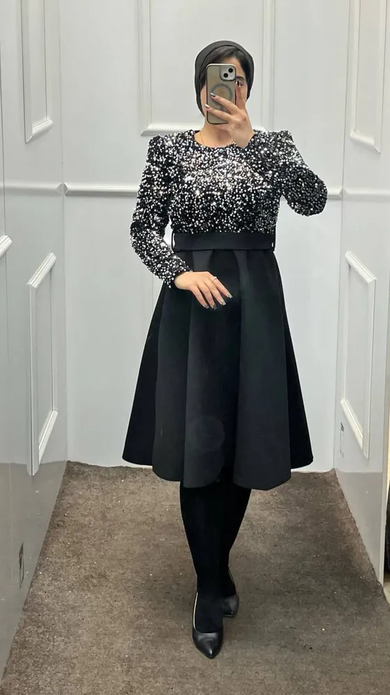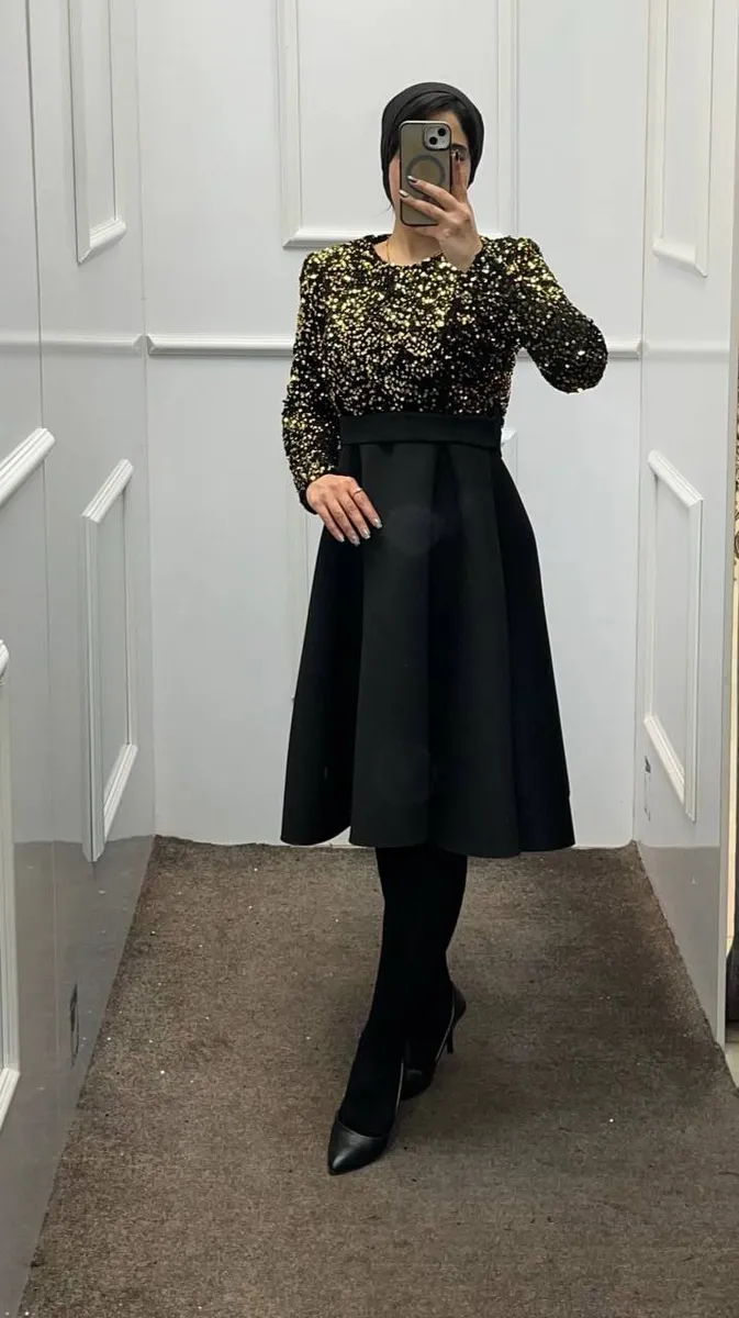 جنس لوکس و چشمنواز: بالاتنه این پیراهن از پولک مخمل براق تهیه شده که در هر حرکتی، نوری خیرهکننده منعکس میکند و شما را در کانون توجه قرار میدهد. دامن نیز از غواصی ساندویچی با فرم زیبا و شیک دوخته شده است که علاوه بر ایستایی فوقالعاده، لطافت و راحتی بینظیری را ارائه میدهد. این ترکیب پارچه، تارا کد 1 را به یک اثر هنری پوشیدنی تبدیل کرده است.