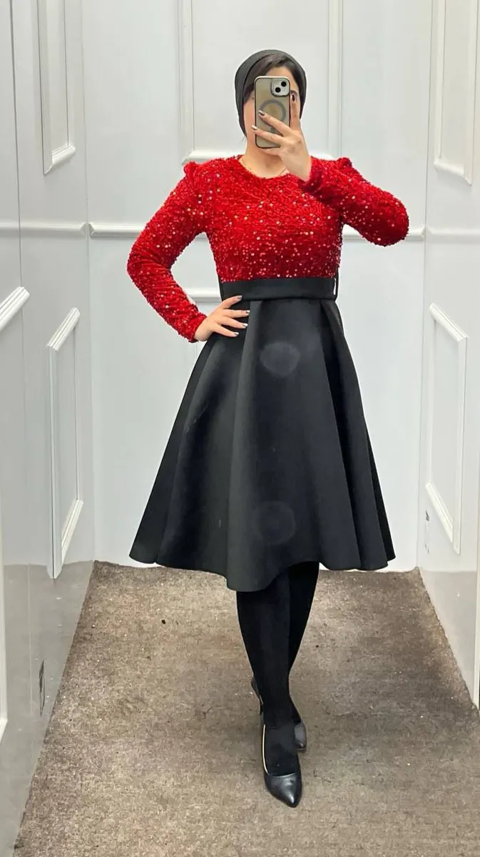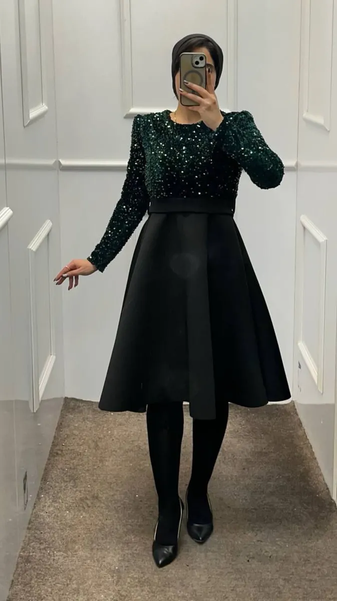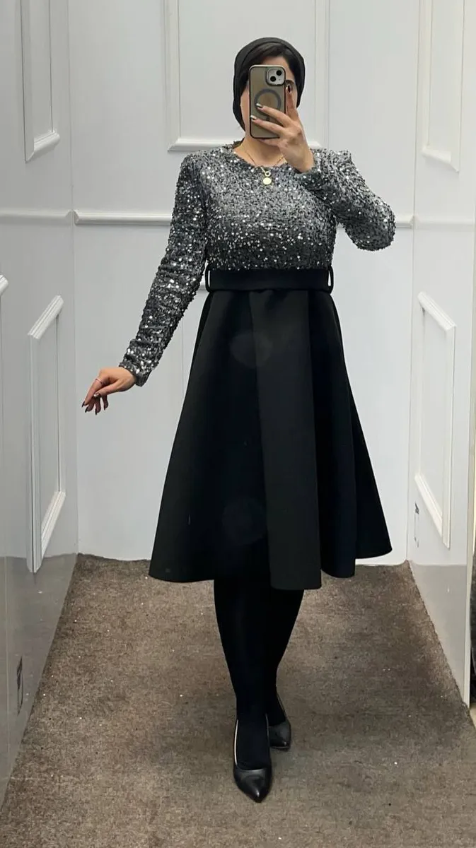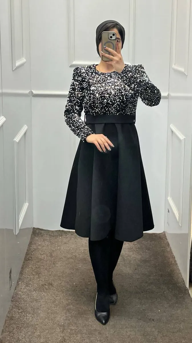 جنس لوکس و چشمنواز: بالاتنه این پیراهن از پولک مخمل براق تهیه شده که در هر حرکتی، نوری خیرهکننده منعکس میکند و شما را در کانون توجه قرار میدهد. دامن نیز از غواصی ساندویچی با فرم زیبا و شیک دوخته شده است که علاوه بر ایستایی فوقالعاده، لطافت و راحتی بینظیری را ارائه میدهد. این ترکیب پارچه، تارا کد 1 را به یک اثر هنری پوشیدنی تبدیل کرده است.