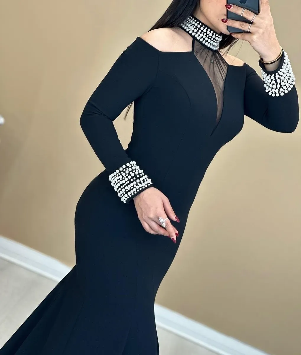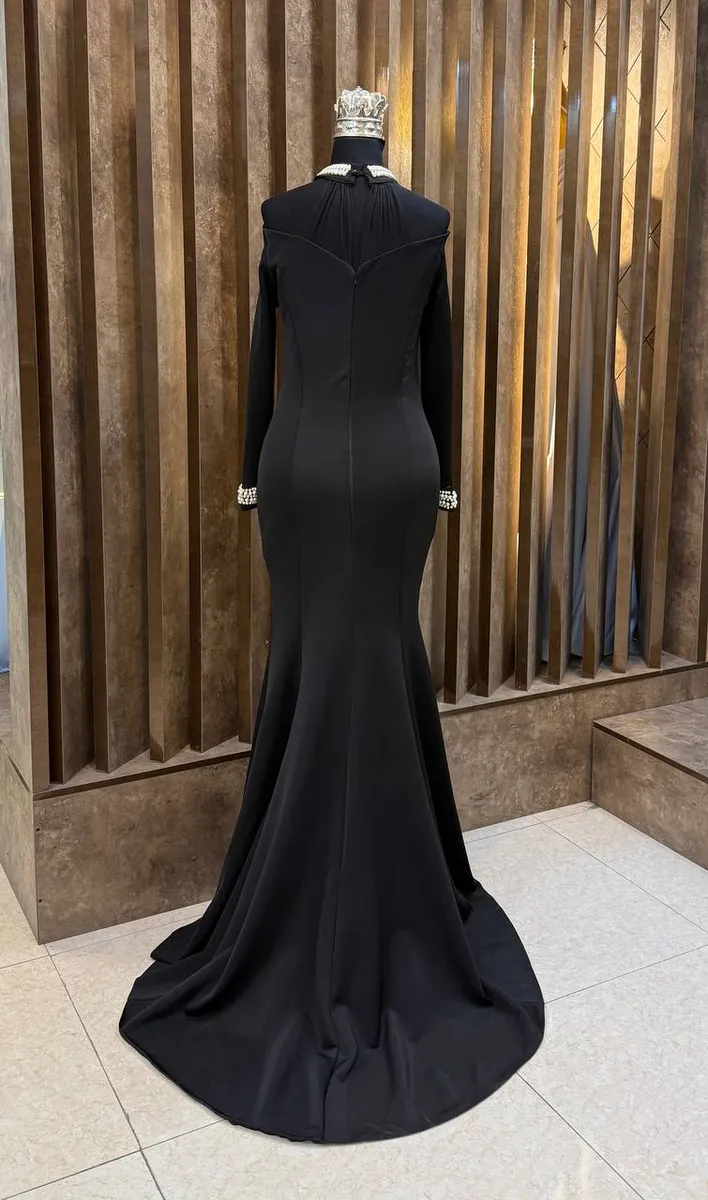 آنچه این لباس را خاصتر میکند، تزئینات مرواریدی ظریف روی یقه و سرآستینهاست که جلوهای لوکس و چشمگیر به آن داده است.