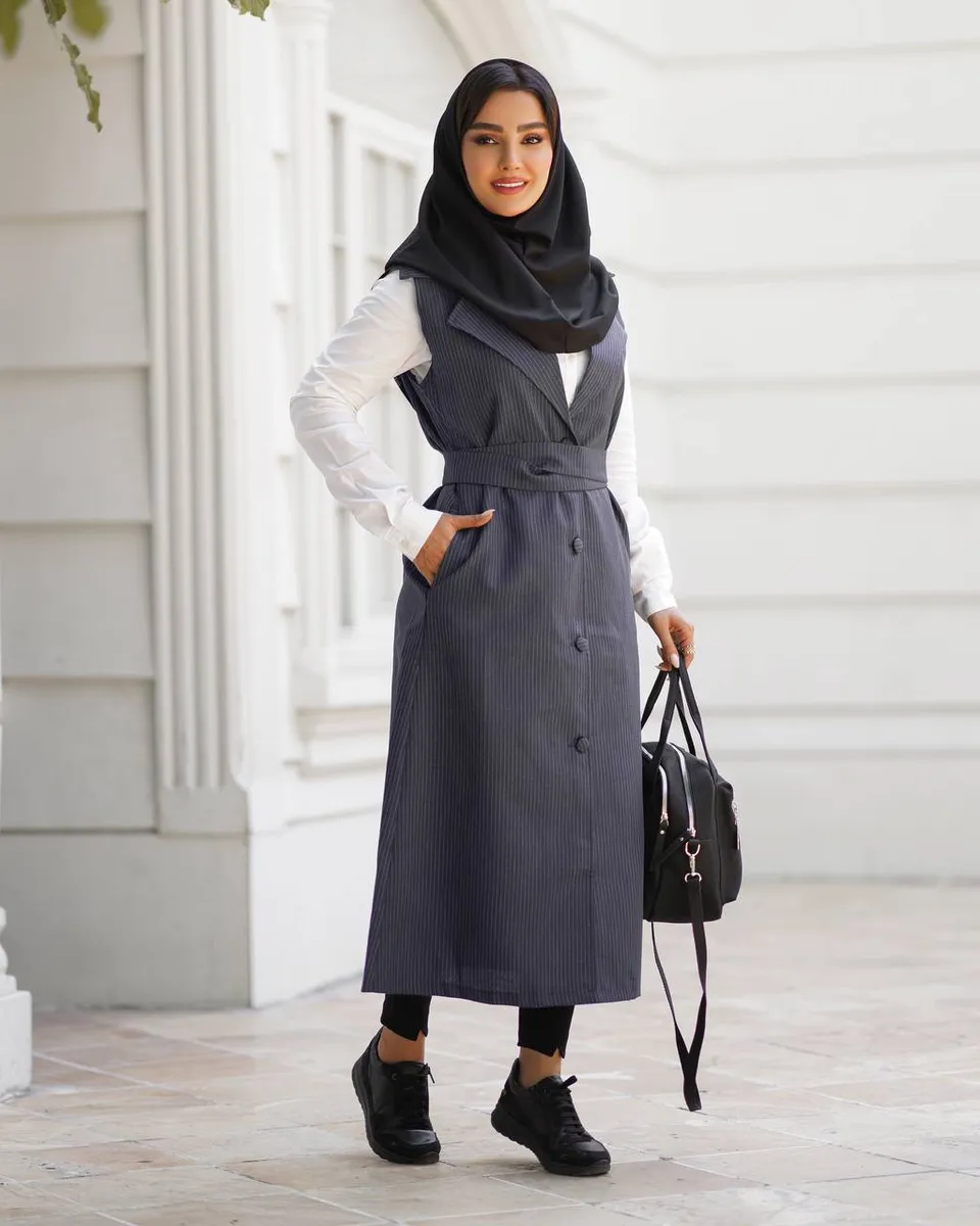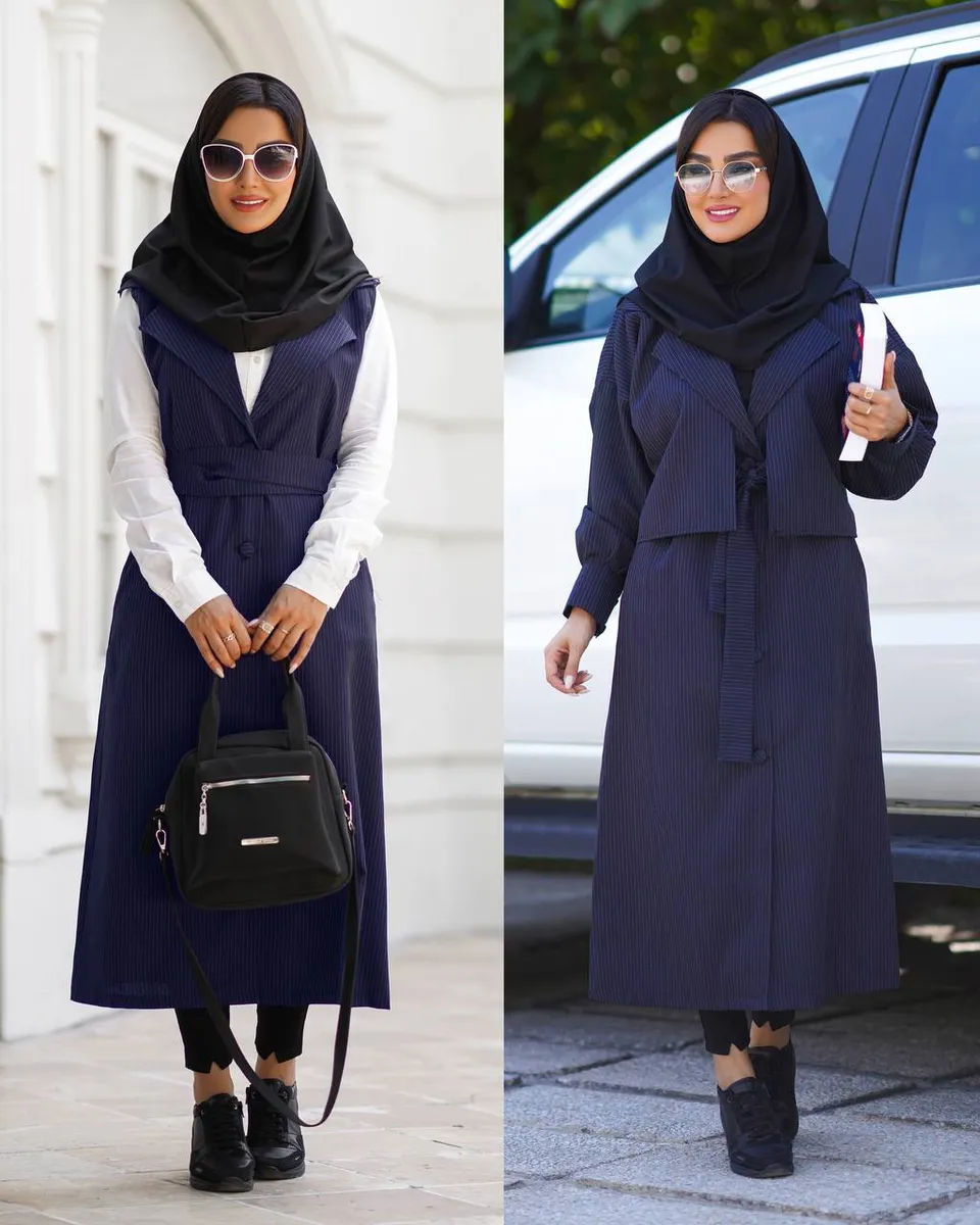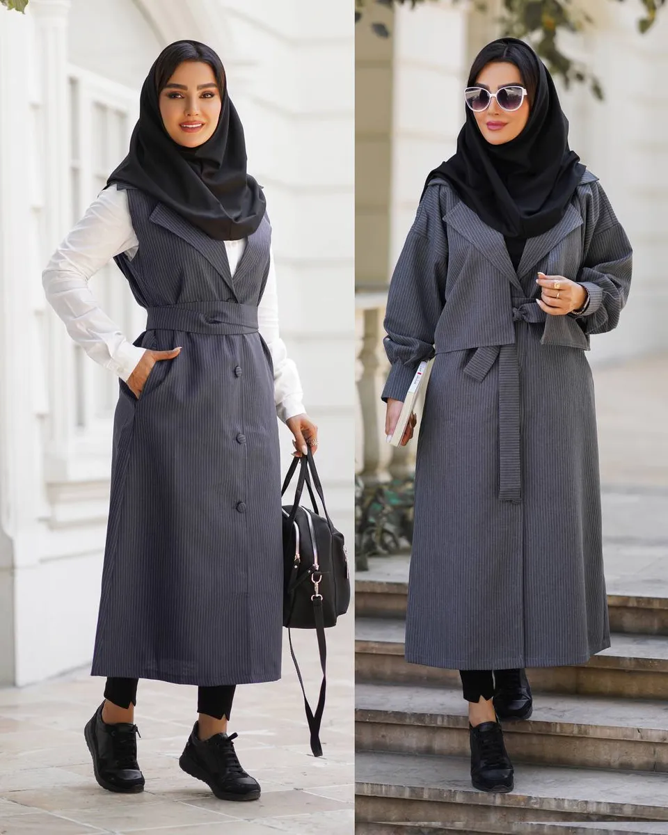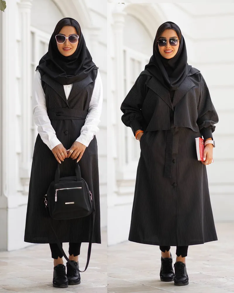 کت و سارافون با هم – مانتویی شیک و پوشیده: وقتی کت را روی سارافون میپوشید، یک مانتوی کامل و بسیار شیک دارید که برای دانشگاه، محل کار، و یا گشت و گذارهای روزمره کاملاً مناسب است و به شما ظاهری رسمی و آراسته میبخشد.