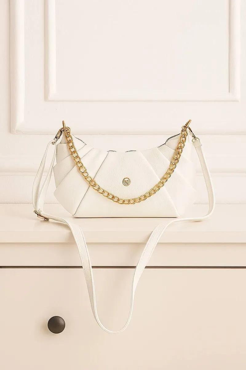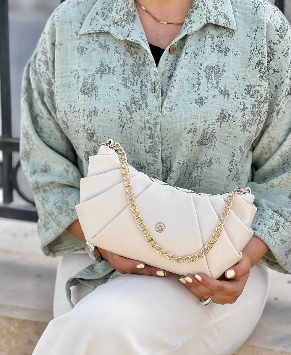 این کیف کوچک و شیک با طراحی چیندار کروسانی، انتخابی بینظیر برای استایلهای مجلسی و مهمانیهاست.
