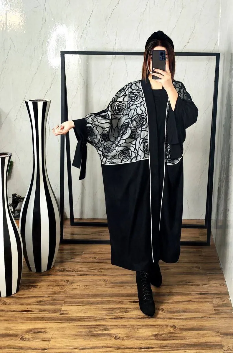 این مانتوی شیک از جنس کرپ کش و تور باکیفیت دوخته شده و به خاطر خرجکار نوار مغزی سفید، جلوهای خاص و متفاوت دارد. 🌹