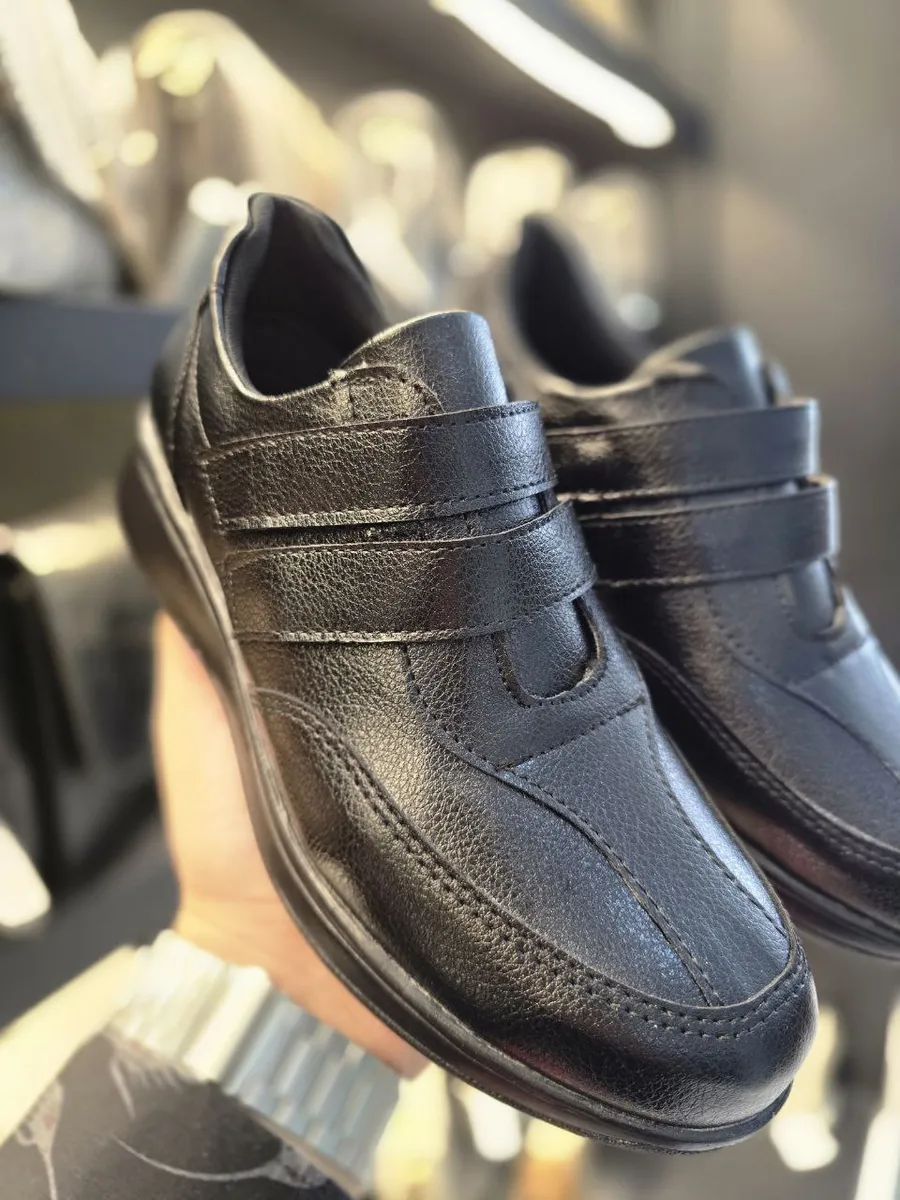 بند دوچسبی محکم به شما امکان تنظیم بهتر را داده و پوشیدن و درآوردن کفش را بسیار آسان میکند. جنس رویه چرم مشکی علاوه بر زیبایی، ظاهری کلاسیک و شیک به استایل شما میبخشد.