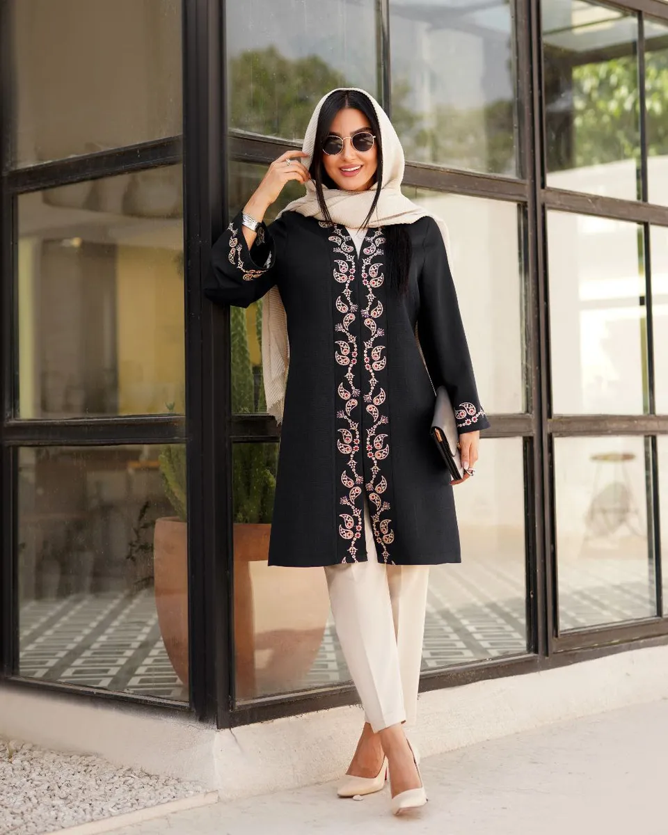 * **سجاف گلدوزی شده:** **سجاف گلدوزی شده** در مانتو "سولماز"، نقطه کانونی زیبایی آن است. این طرح گلدوزی نفیس، ظرافت و هنر را به لباس اضافه کرده و آن را از مانتوهای ساده متمایز میسازد.