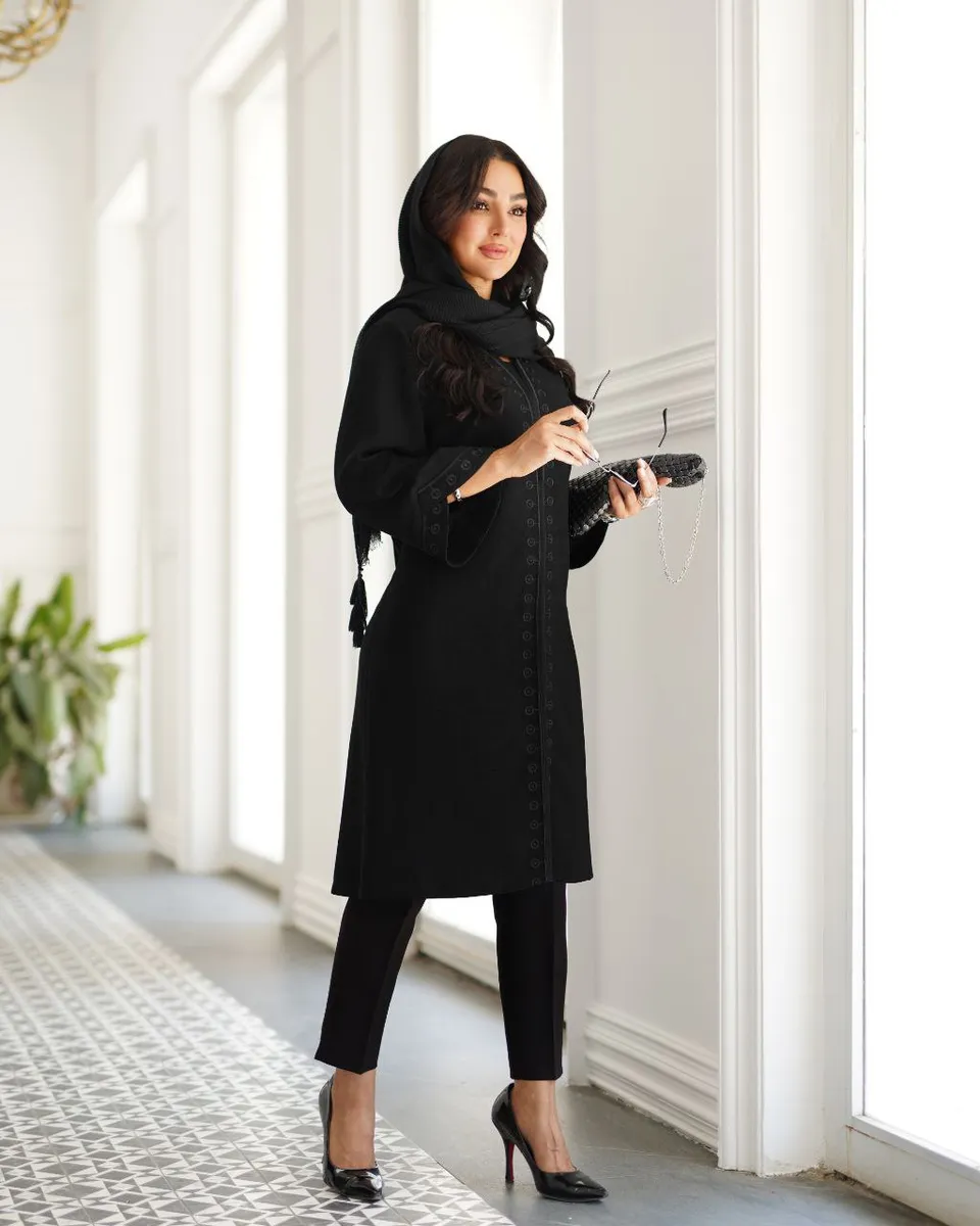 * **رنگ مشکی کلاسیک با گلدوزی خاص:** این مانتو در رنگ **تک مشکی** عرضه شده است که با گلدوزیهای **کرم و مشکی**، ترکیبی زیبا و شیک را به وجود آورده است. این رنگبندی، مانتو را برای موقعیتهای مختلف و ست کردن آسان مناسب میسازد.