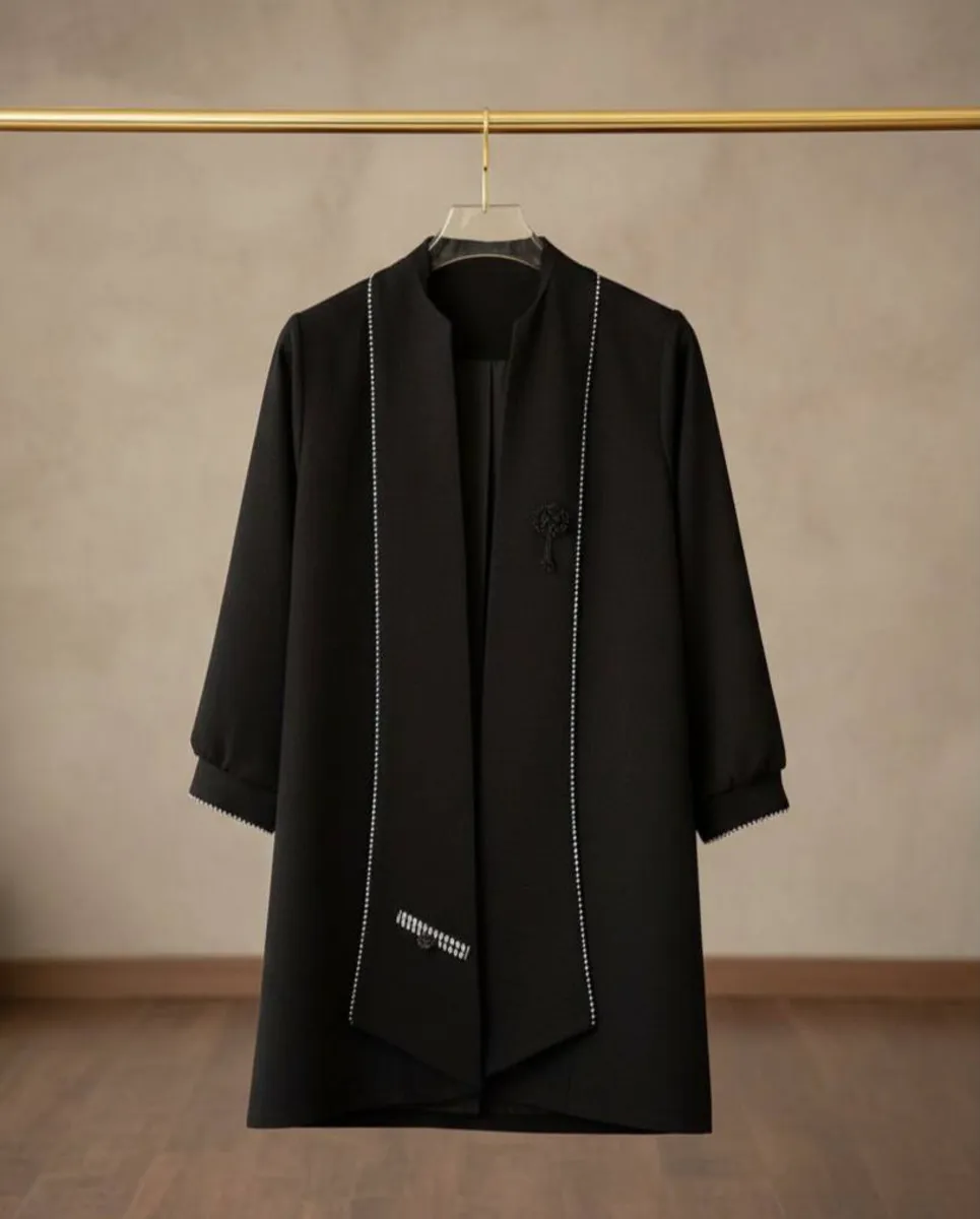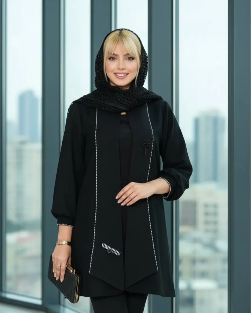 * **رنگ مشکی مطلق:** رنگ **مشکی تیره و کاملاً ثابت** این مانتو، زیبایی کلاسیک و ماندگاری را تضمین میکند و به راحتی با هر استایلی ست میشود.