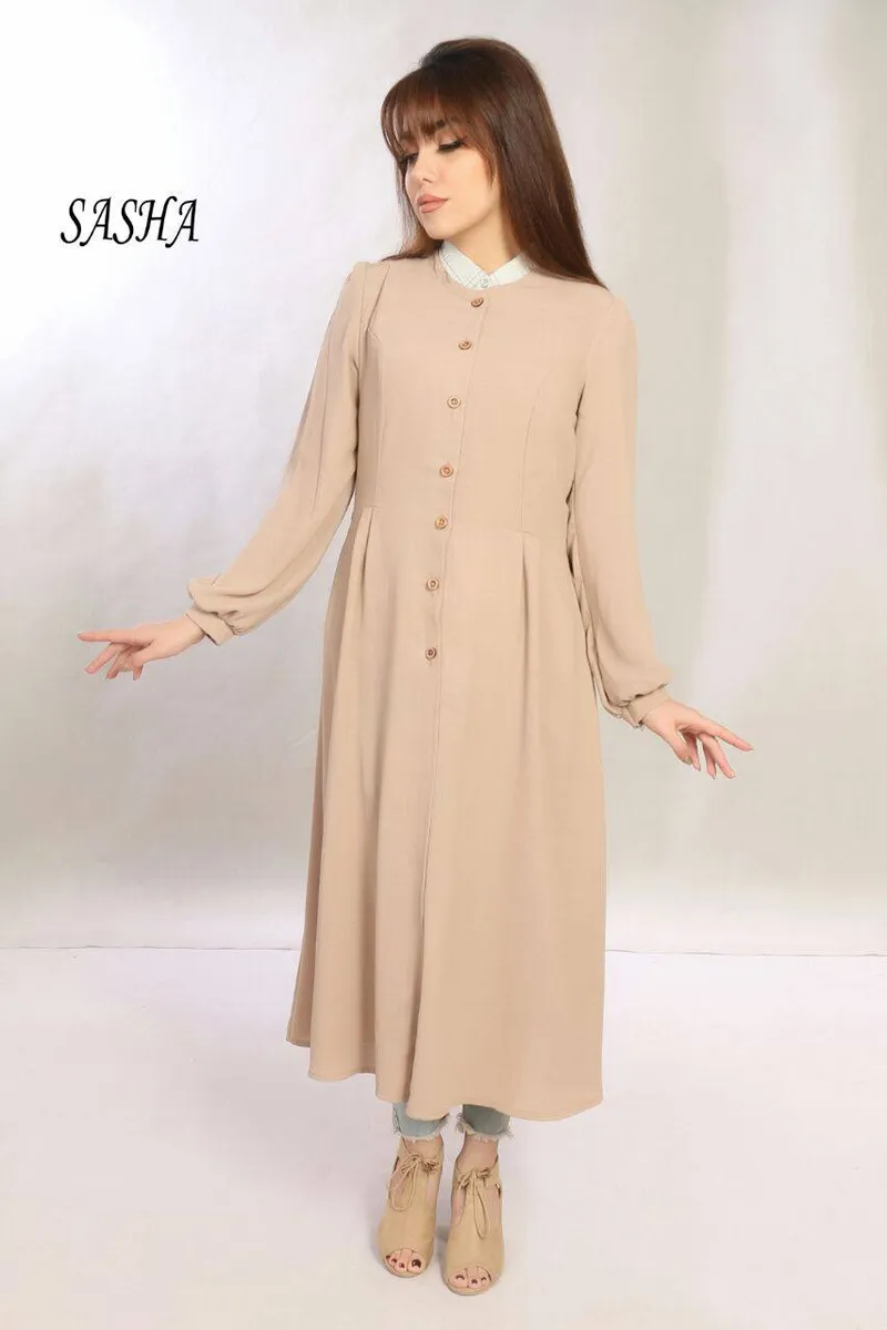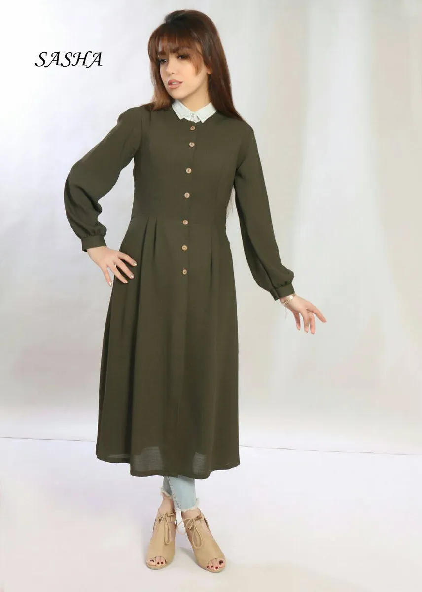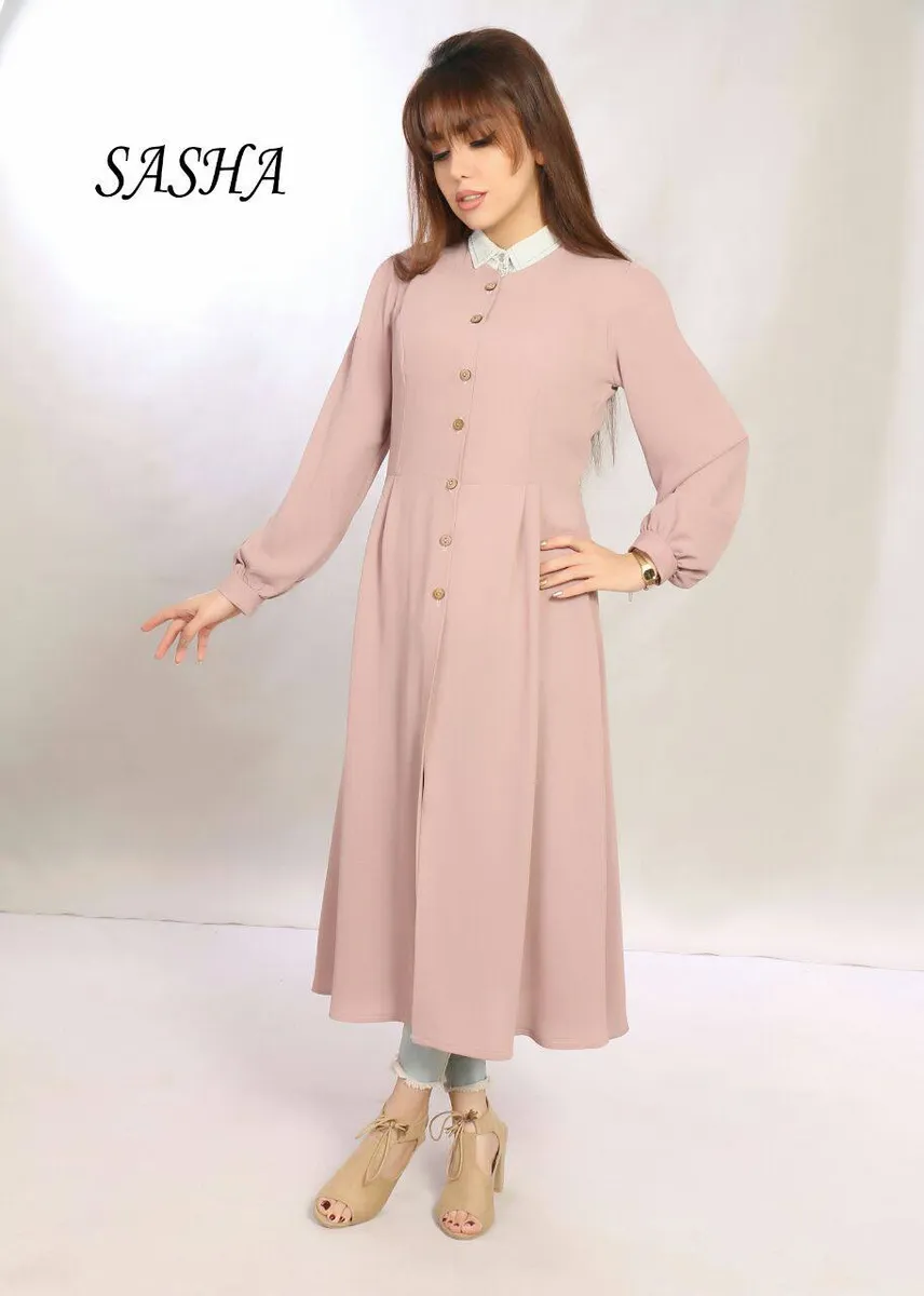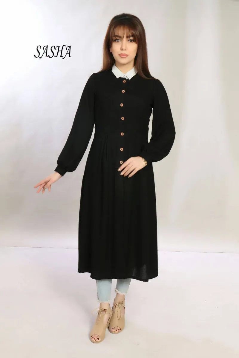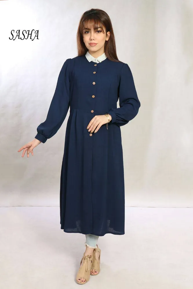 * **مدل مانتو:** ساده، بلند، دکمهدار