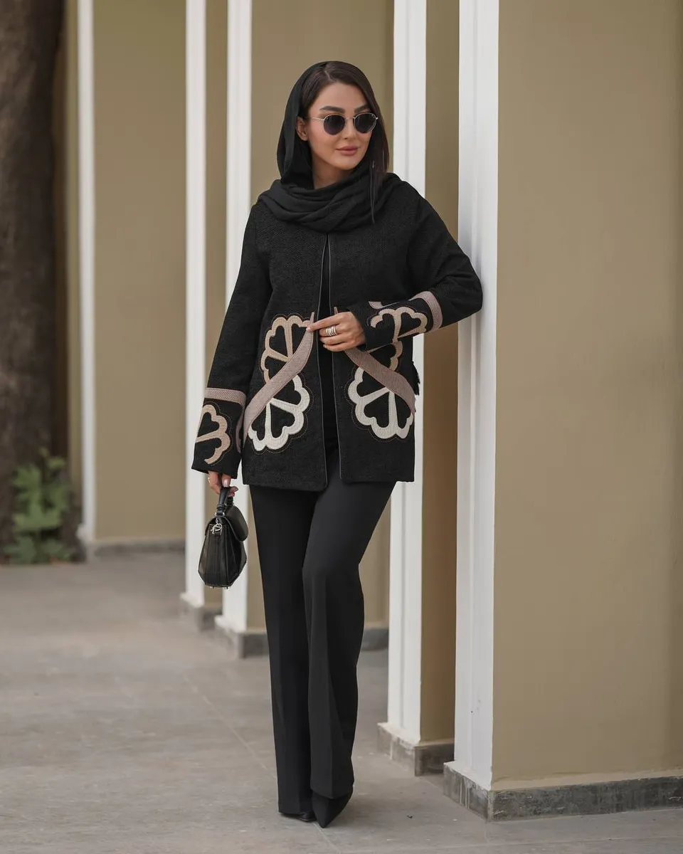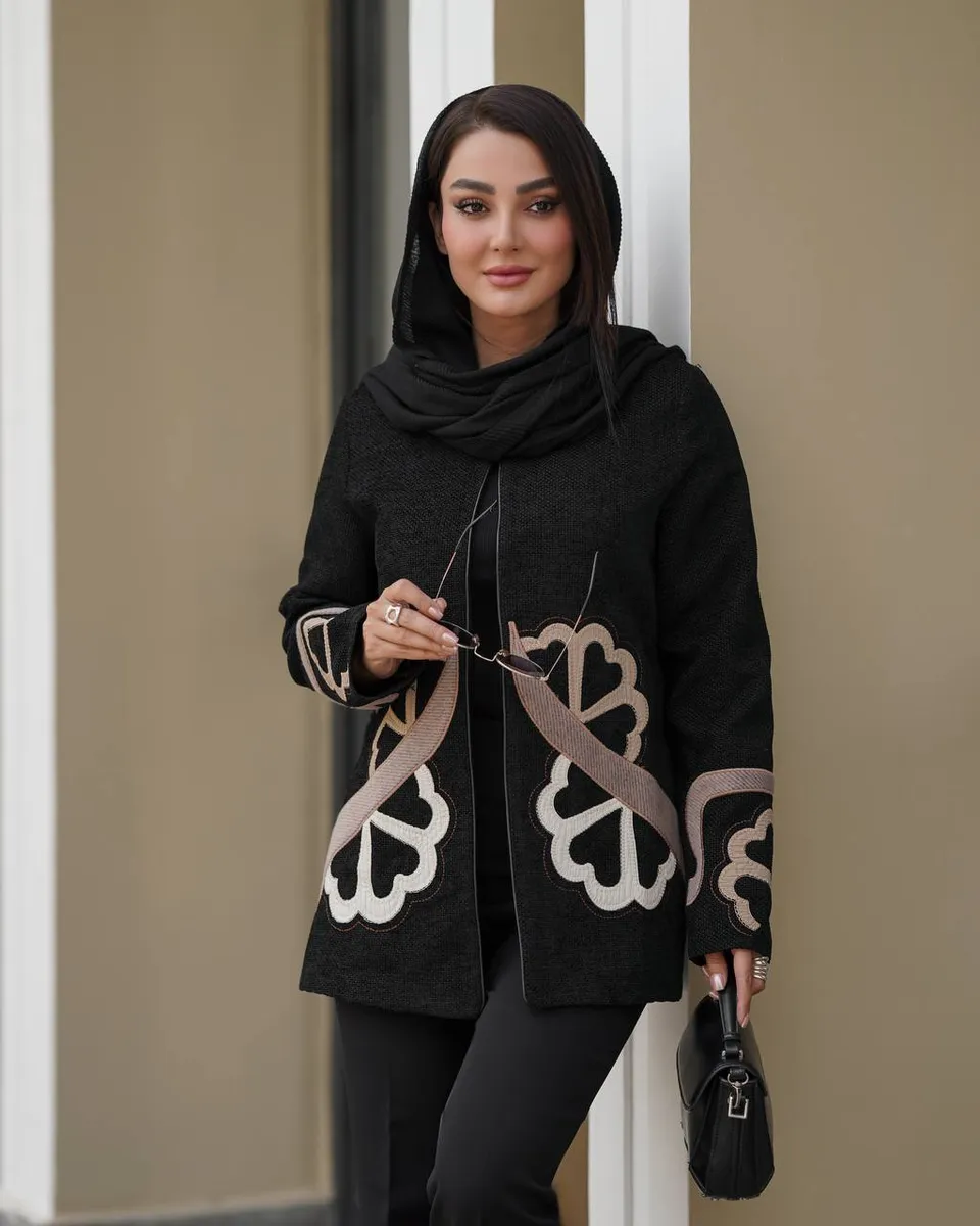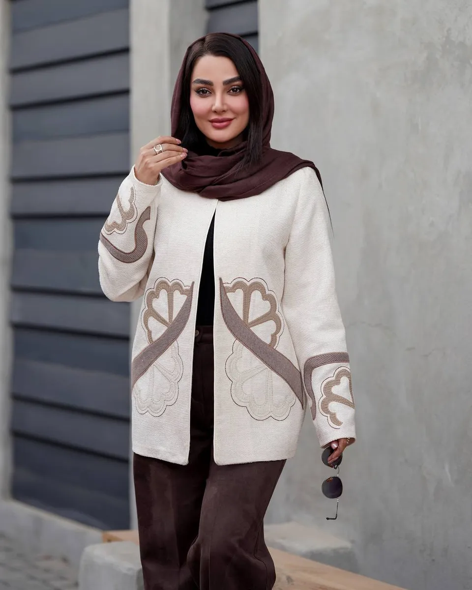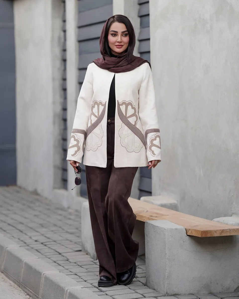 مدل: کت یقه گرد، با طراحی منحصر به فرد تیکهدوزی و گلدوزی طرح شمشیری.