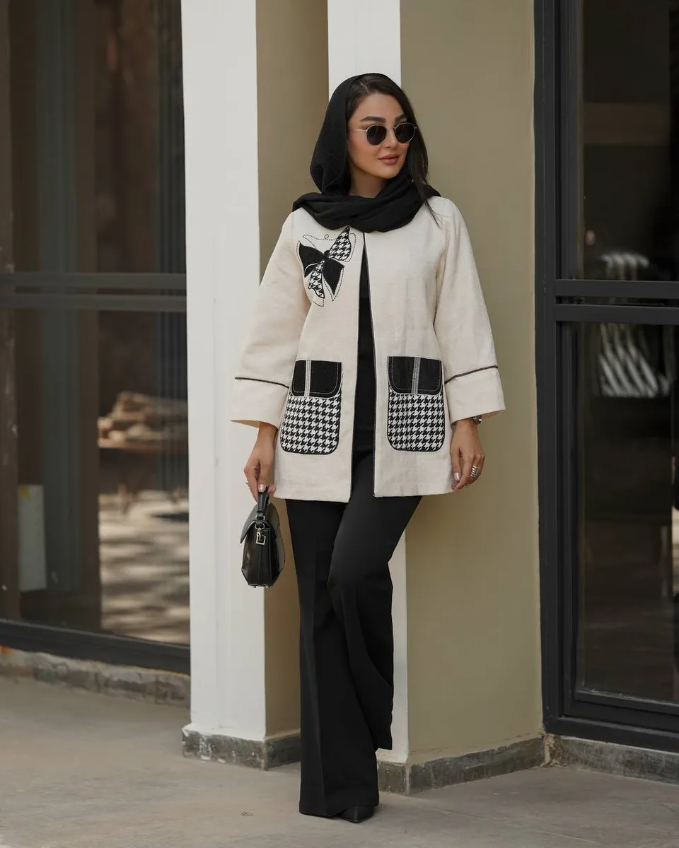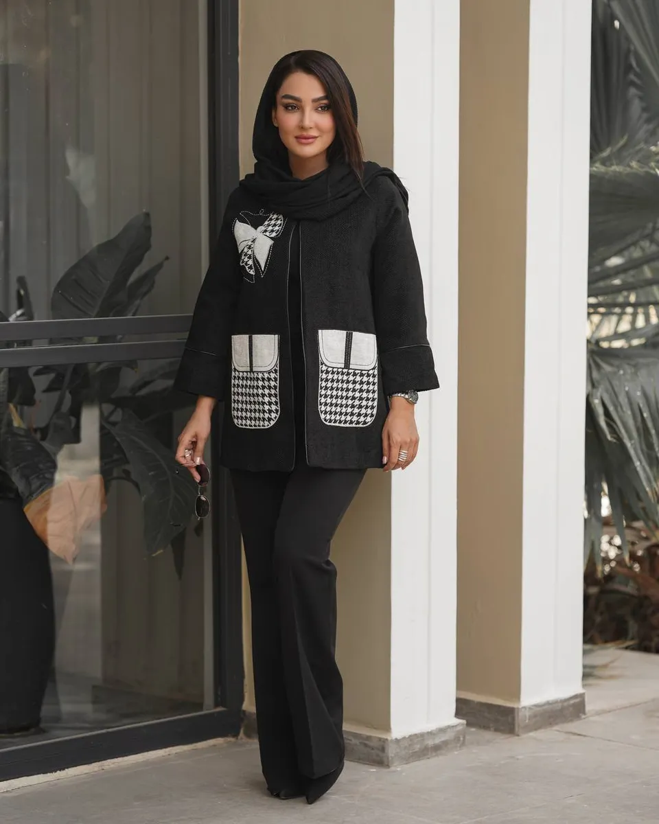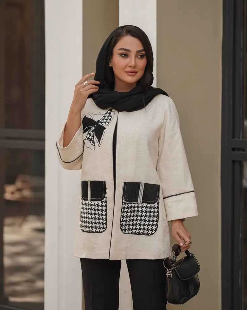 مدل: کت تک یقه گرد، با تزئینات هنرمندانه تیکهدوزی و گلدوزی طرح جیب و پاپیون.