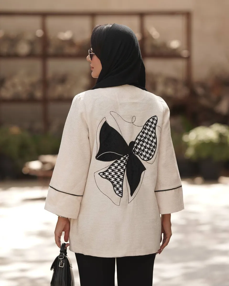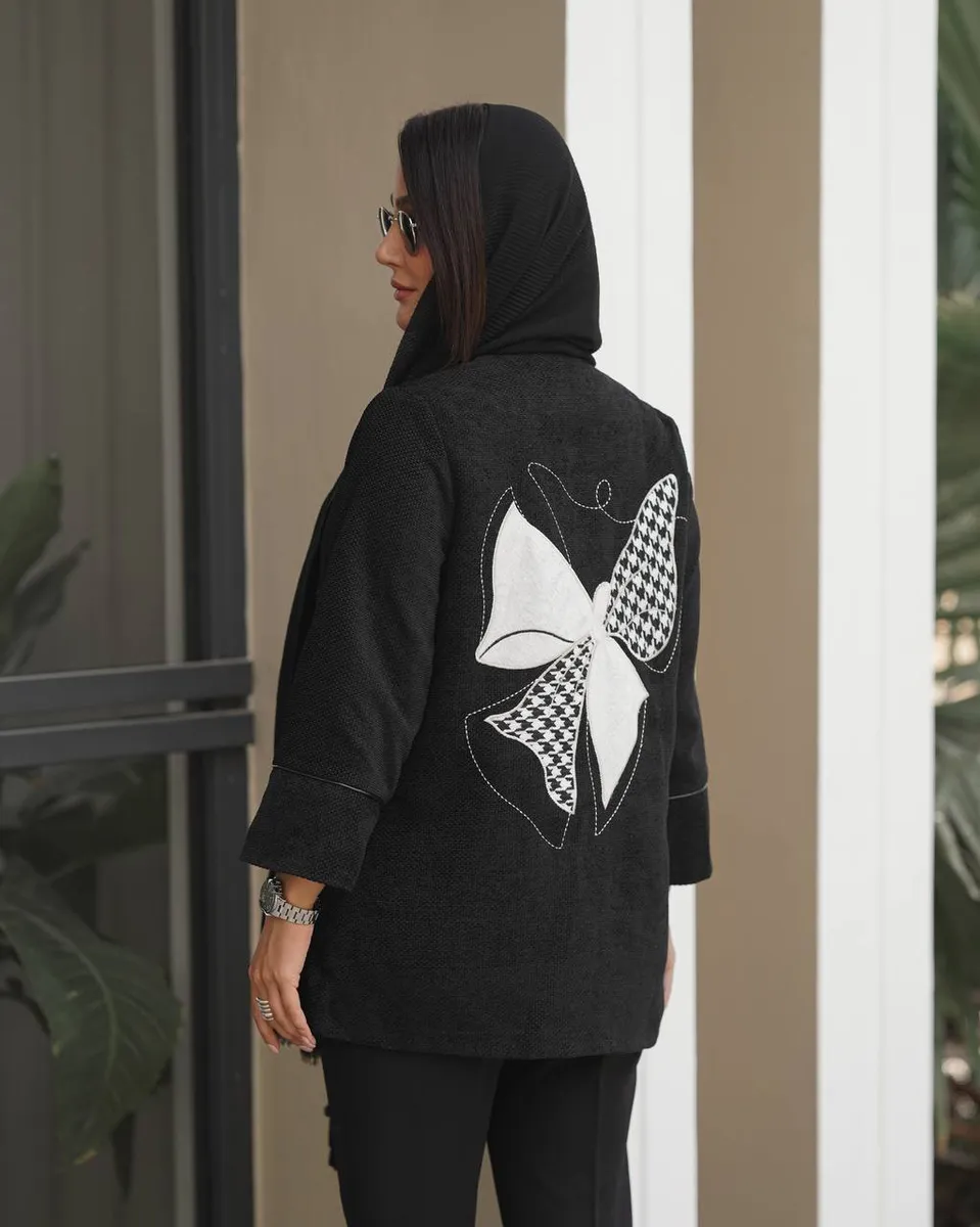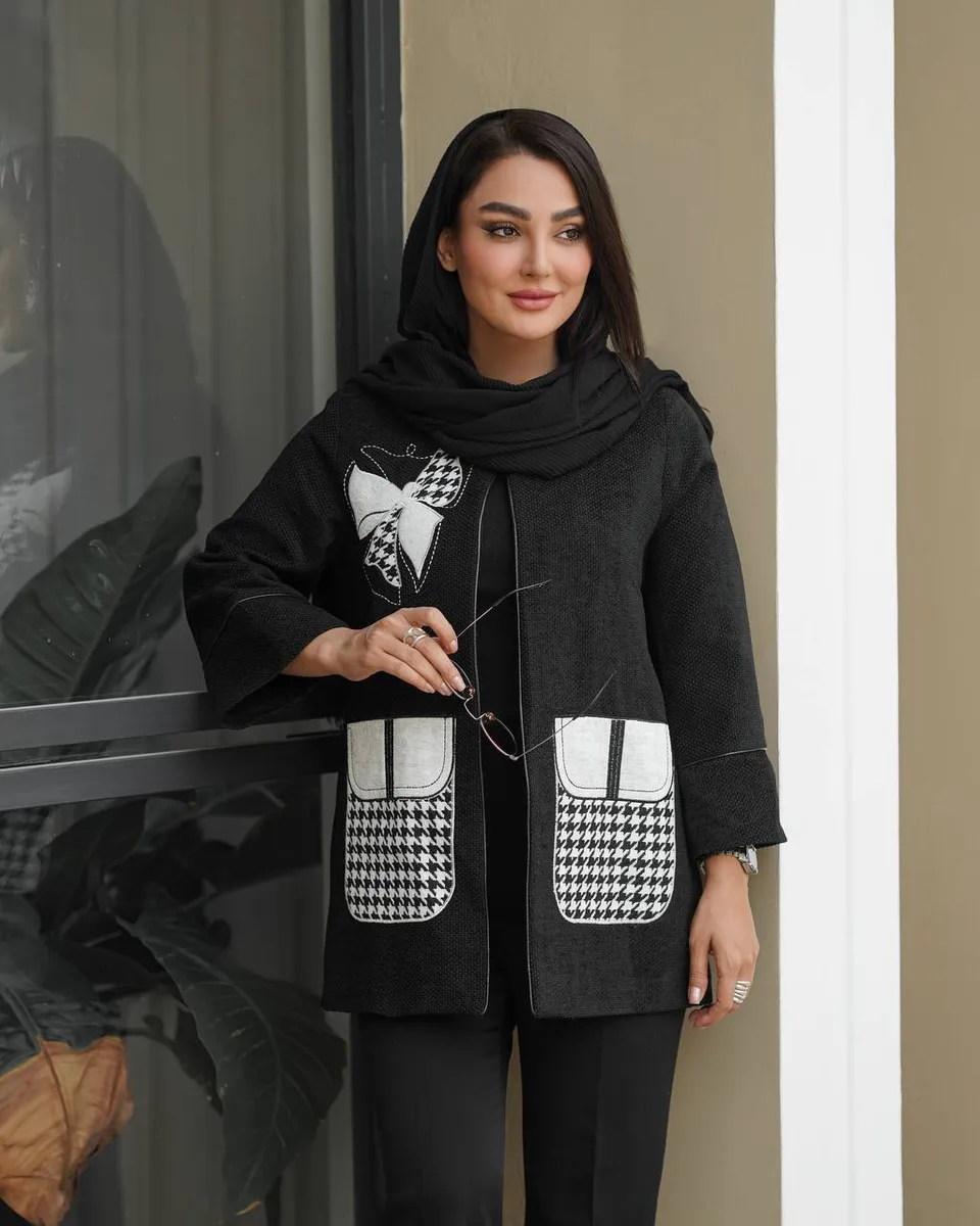 مدل: کت تک یقه گرد، با تزئینات هنرمندانه تیکهدوزی و گلدوزی طرح جیب و پاپیون.