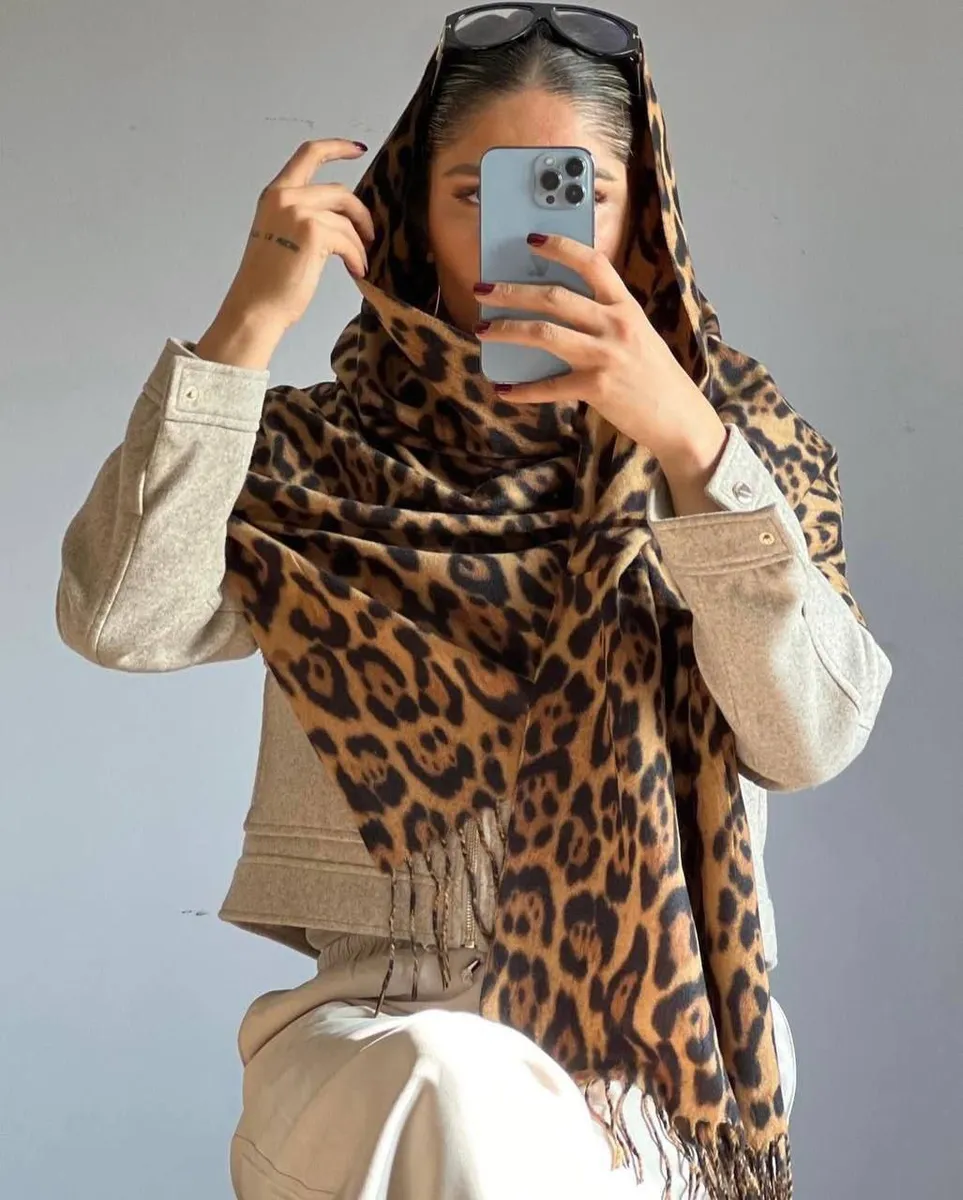 طرح جاودانه پلنگی: طرح پلنگی هرگز از مد نمیافتد و به راحتی میتواند یک استایل مونوکروم (مانند مشکی، کرم یا شتری) را از سادگی خارج کرده و به آن شخصیتی قدرتمند ببخشد.
