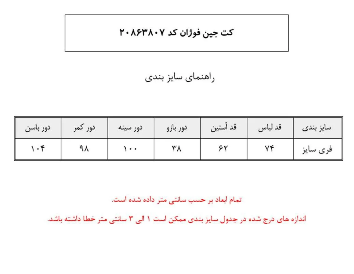 «کت جین فوژان» به صورت **فری سایز (Free Size)** طراحی شده و برای سایزهای 38 تا 44 کاملاً مناسب است. برش استاندارد و راحت این کت باعث میشود به زیبایی روی اندامهای مختلف بنشیند. با این حال، برای اطمینان خاطر و یک انتخاب بینقص، پیشنهاد میکنیم حتماً **جدول راهنمای سایز دقیق** که همراه با تصاویر محصول ارائه شده را بررسی کنید.