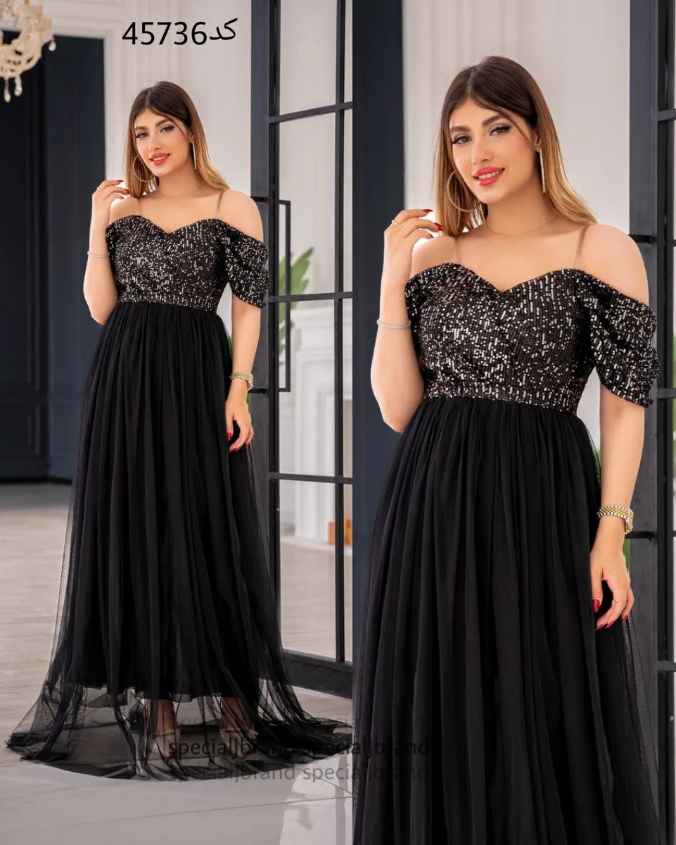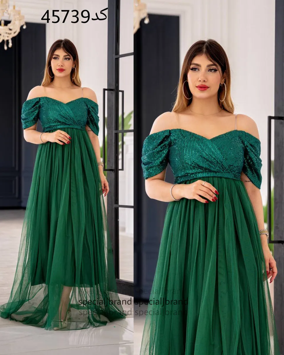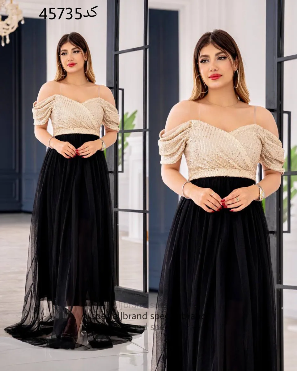 این لباس ماکسی با **طراحی دکلته و دوخت ترکیبی از پولک لوزی و تور ظریف**، جلوهای چشمنواز و شیک دارد که مناسب مراسم **عروسی، نامزدی و عقد** است.