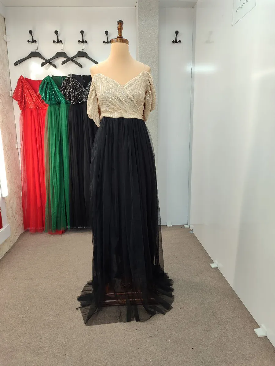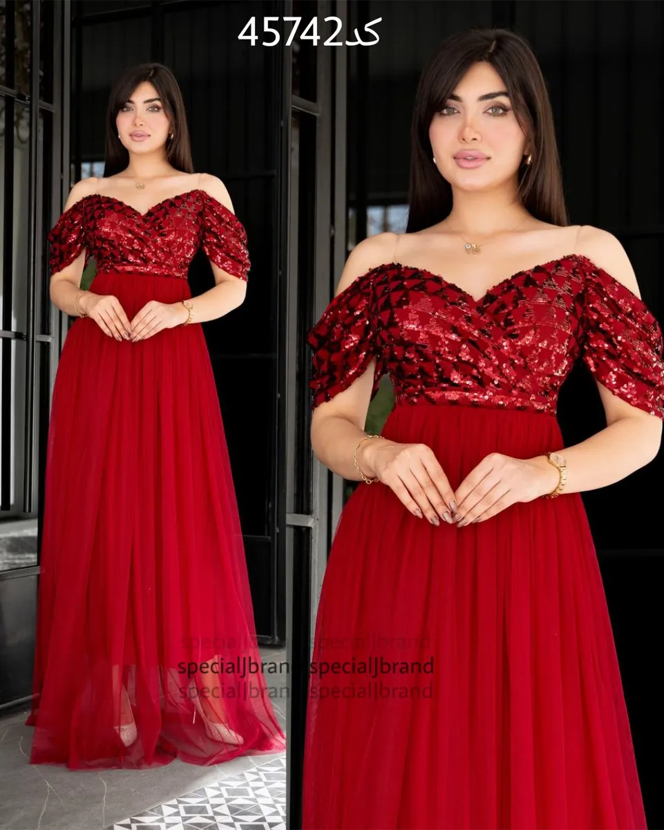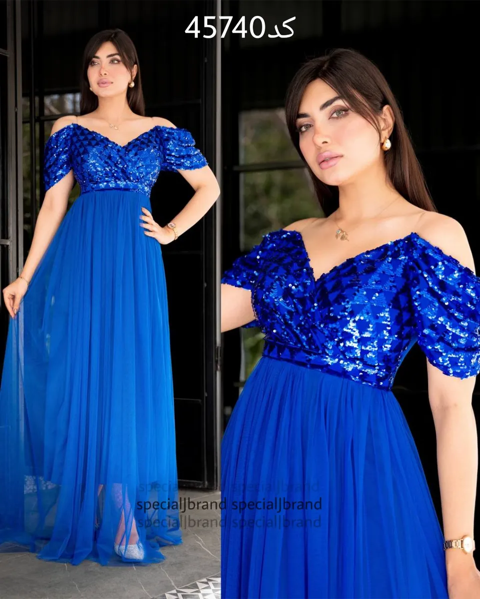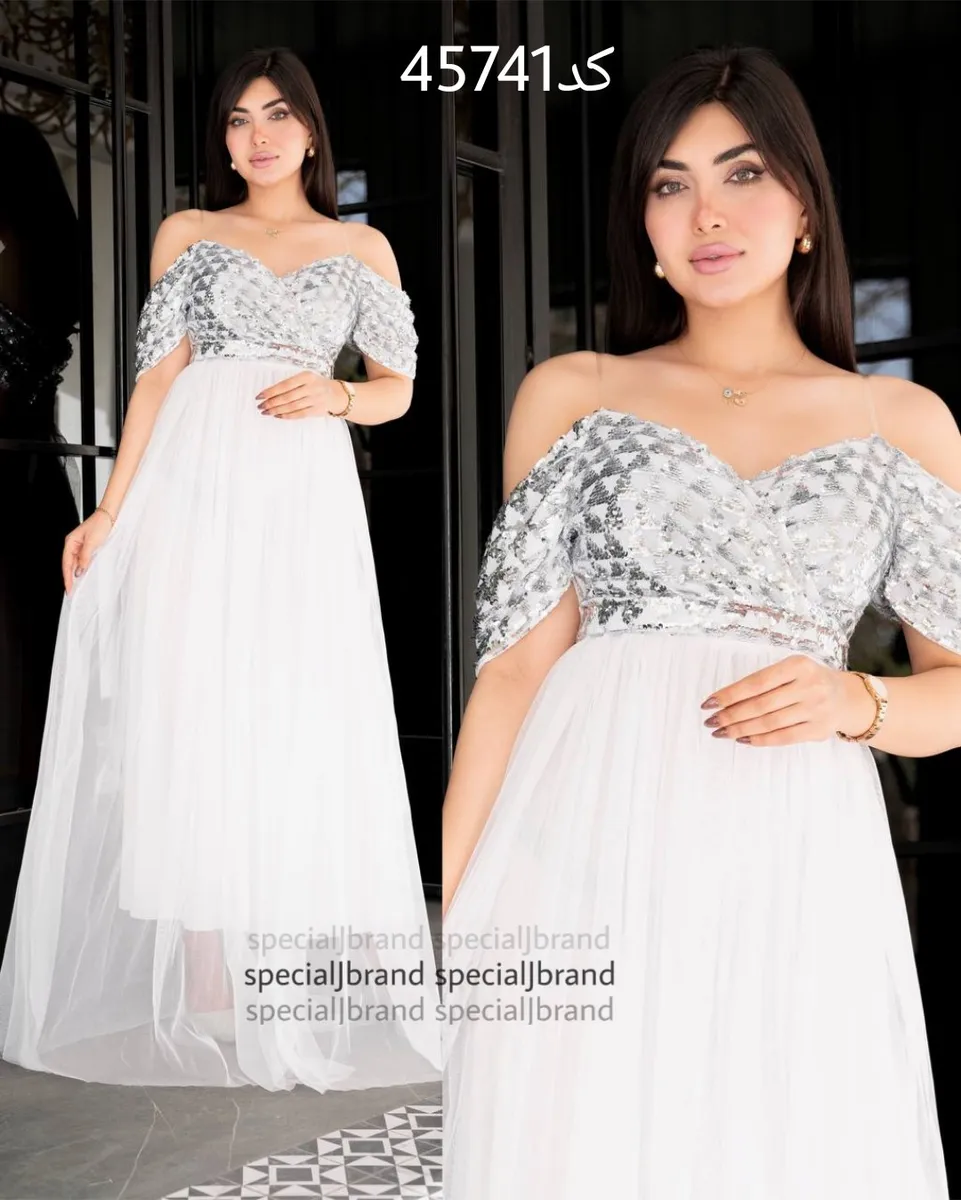 این لباس ماکسی با **طراحی دکلته و دوخت ترکیبی از پولک لوزی و تور ظریف**، جلوهای چشمنواز و شیک دارد که مناسب مراسم **عروسی، نامزدی و عقد** است.