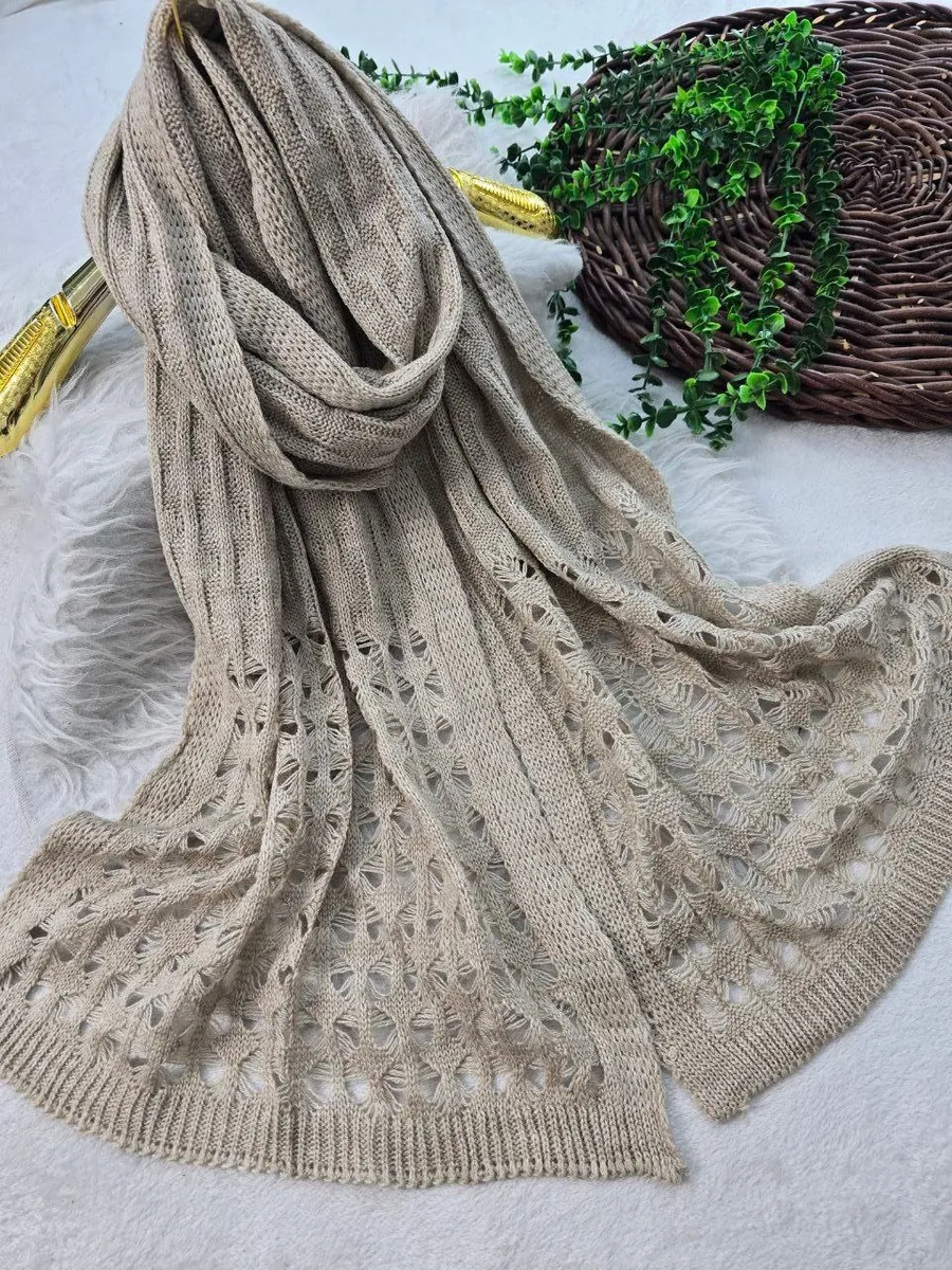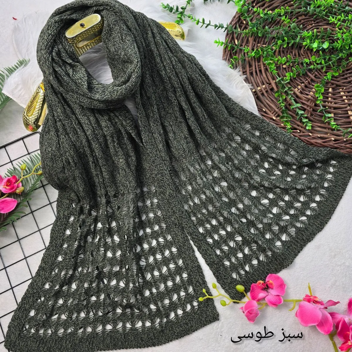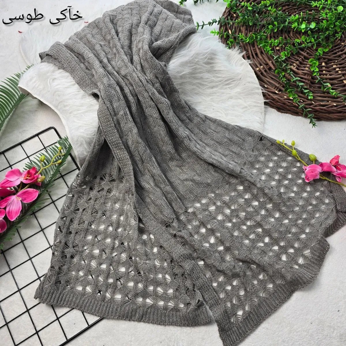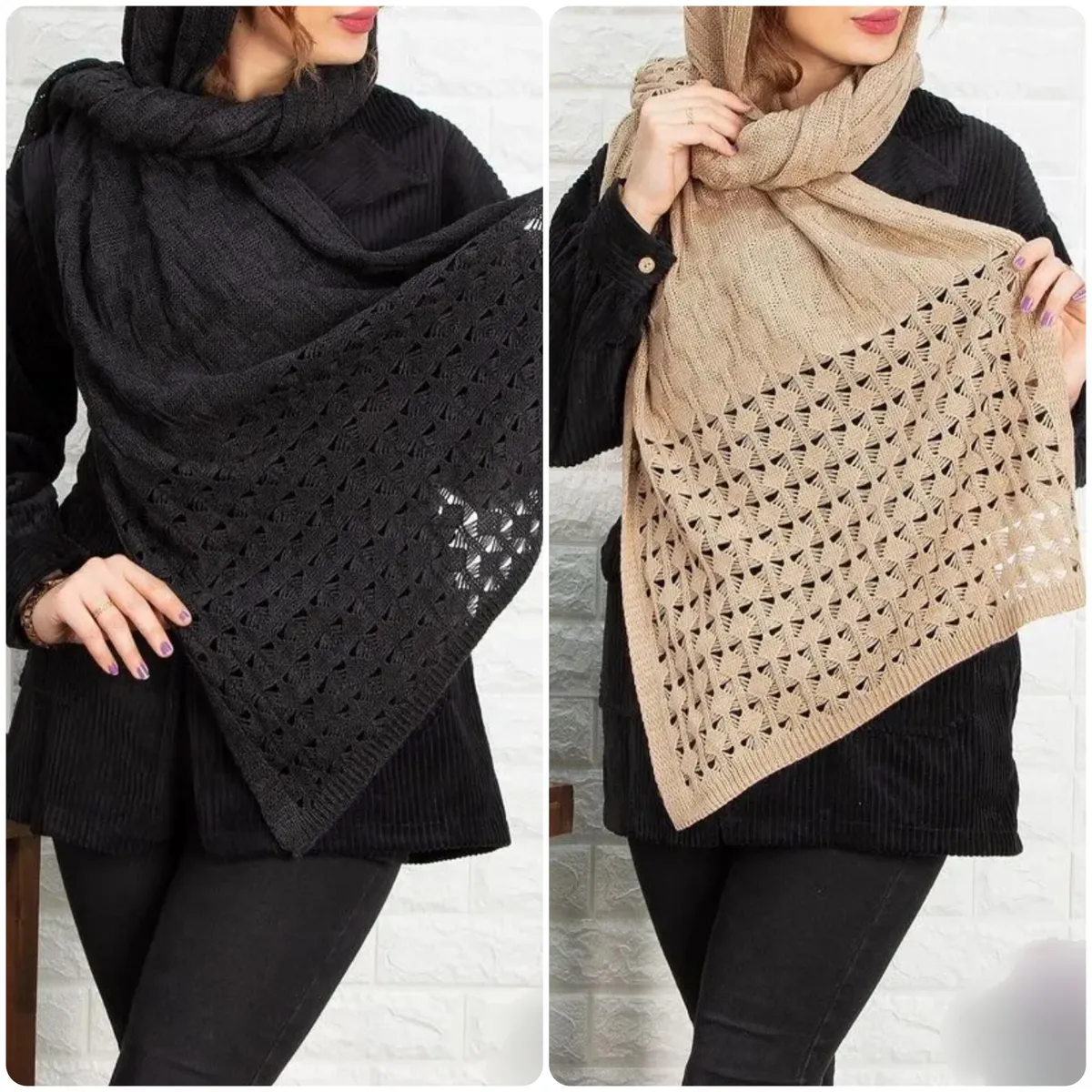 شال بافت طرح سه بعدی ،کل کار بافت طرحدار هست و فقط قسمت دستک شال حالت توری داره