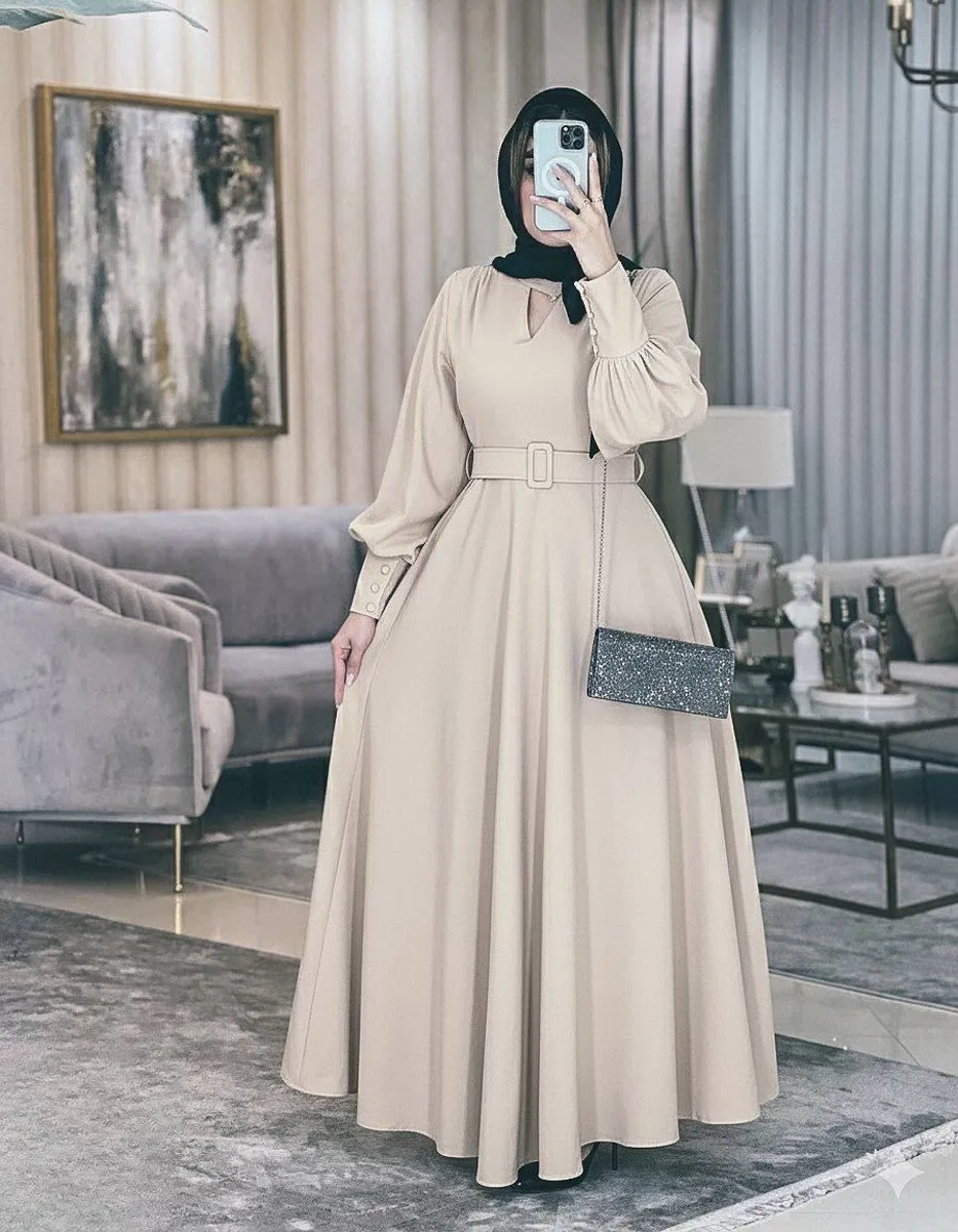 * **آستینهای بلند و شیک:** آستینهای بلند این پیراهن نه تنها پوششی کامل را فراهم میکنند، بلکه با طراحی دقیق خود، به زیبایی و جذابیت کلی لباس افزودهاند و برای استایلهای با حجاب کاملاً مناسب هستند.