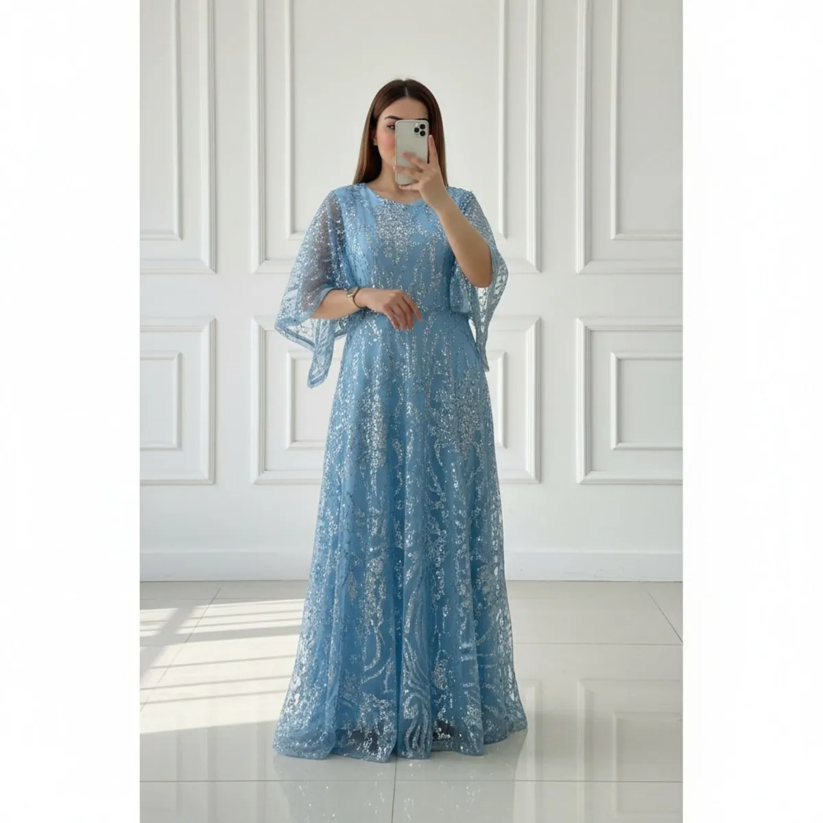 * **پارچه تور شاین؛ تجلی نور و رؤیا:** جنس اصلی این لباس، تور شاین است که با ذرات درخشان و اکلیلی پوشیده شده. این پارچه در زیر نور، بازتابی خیرهکننده و جادویی ایجاد میکند و جلوهای لوکس و پرنسسی به استایل شما میبخشد. با هر حرکت شما، درخششی ظریف و چشمنواز اطرافیان را مجذوب خواهد کرد.