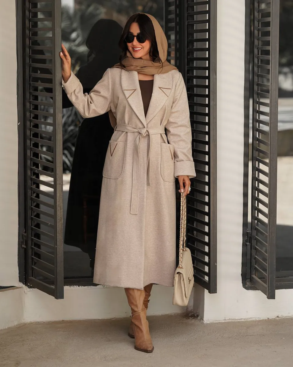 یقه آرشال: این مدل یقه با فرم منحنی و یکپارچه خود، حالتی رسمی و زیبا به پالتو میدهد و خطوط عمودی زیبایی در اندام ایجاد میکند که به کشیدهتر دیده شدن شما کمک میکند.