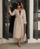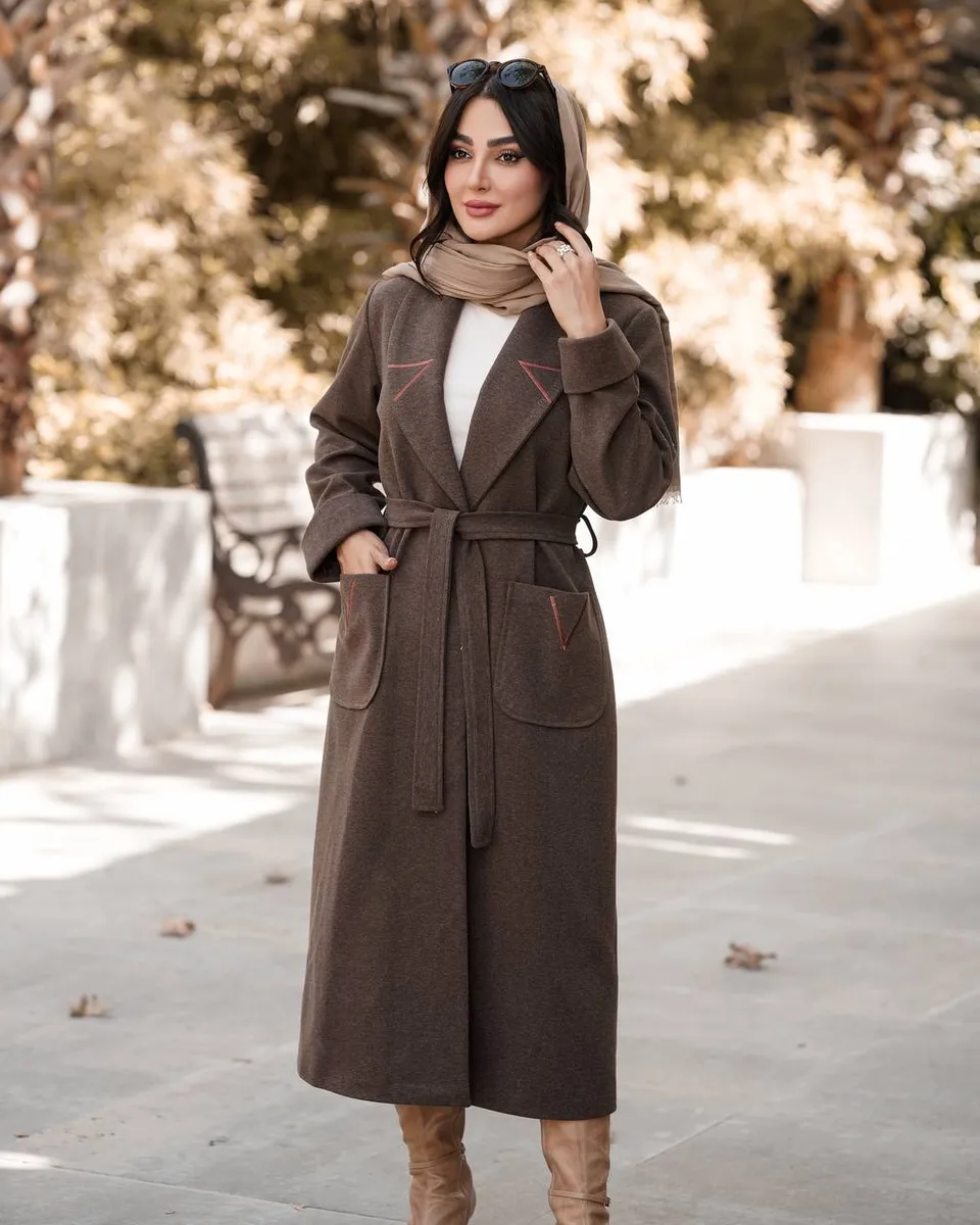 گلدوزی طرح V: جزئیات گلدوزی ظریف که به شکل حرف V روی پالتو کار شده، یک امضای هنری و منحصربهفرد به این مدل افزوده است. این طراحی هوشمندانه، نگاه را به سمت مرکز بدن جلب کرده و به ایجاد تناسب بصری بهتر در اندام کمک میکند.