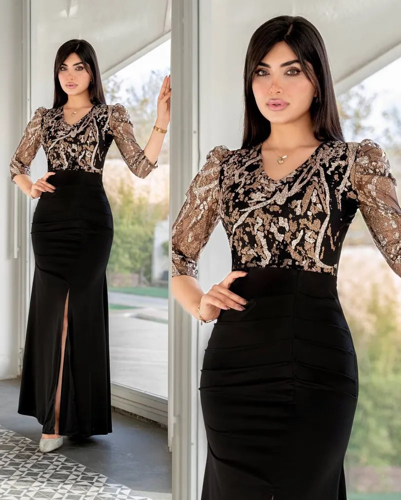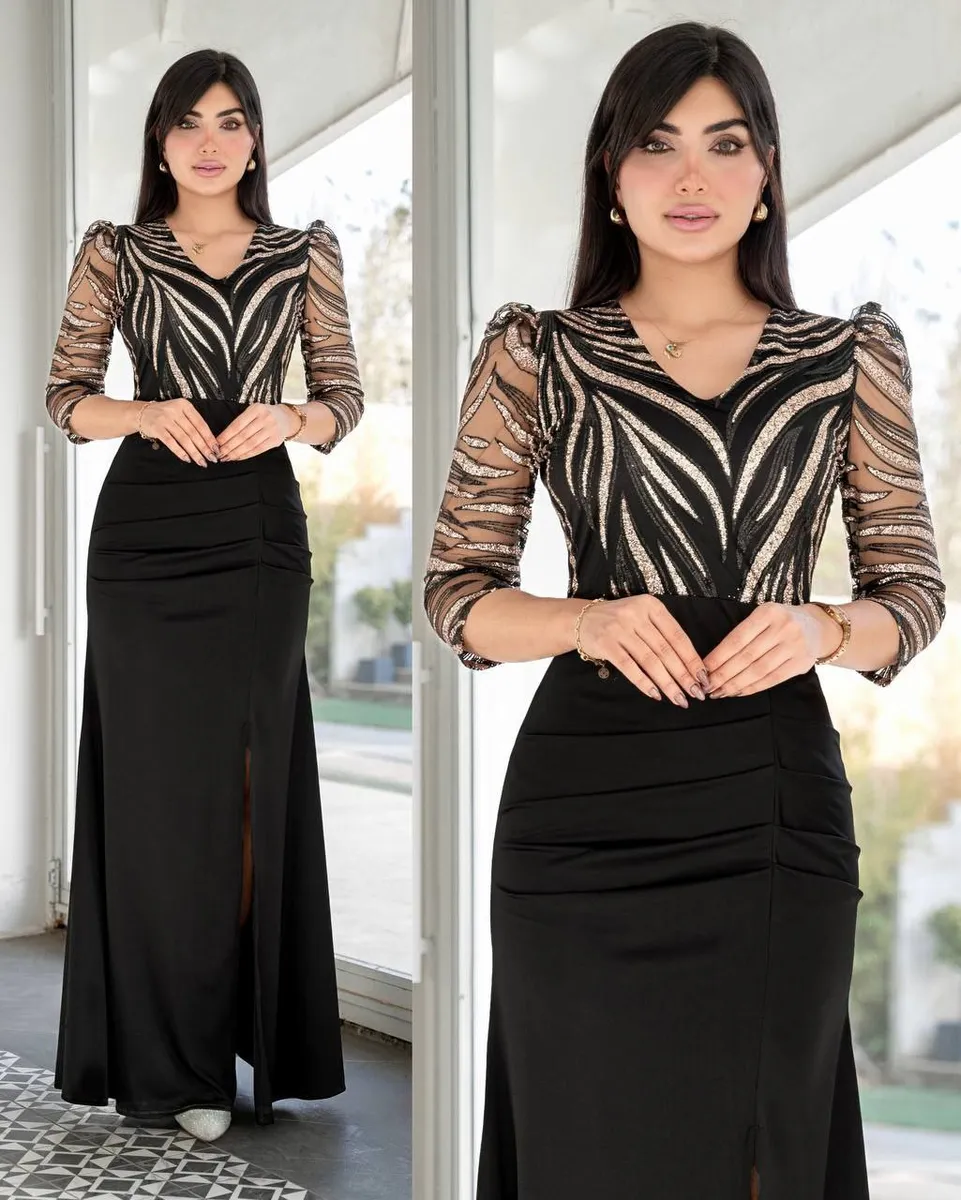 💫 ویژگیها: فرم الـگانس ماکسی، چاک جلوی ظریف، درخشش پوشیده و شیک