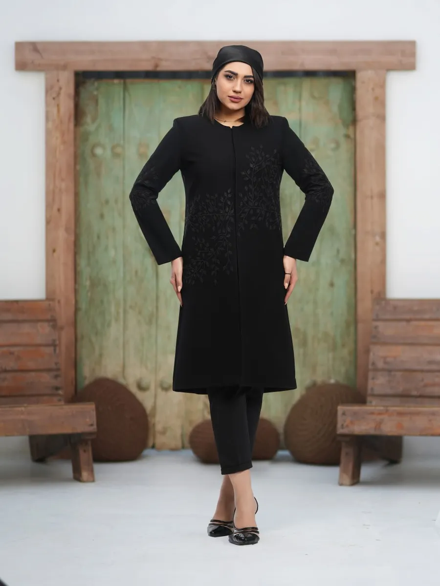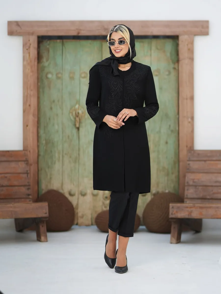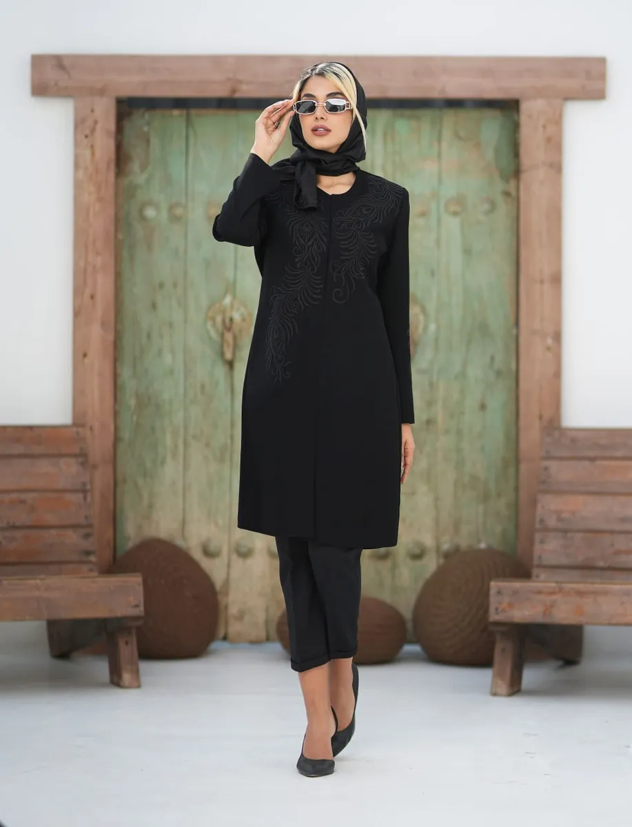 دوختهشده از کرپ باربی وارداتی درجهیک، این مدل ضمن داشتن لطافت و درخشش ملایم، در فرم بدن ایست فوقالعادهای دارد. خرجکار گلدوزی خاویاری در سه طرح متفاوت روی مانتو، جلوهای فاخر و چشمگیر ایجاد کرده که بدون نیاز به اکسسوری اضافه، استایل را کامل میکند.