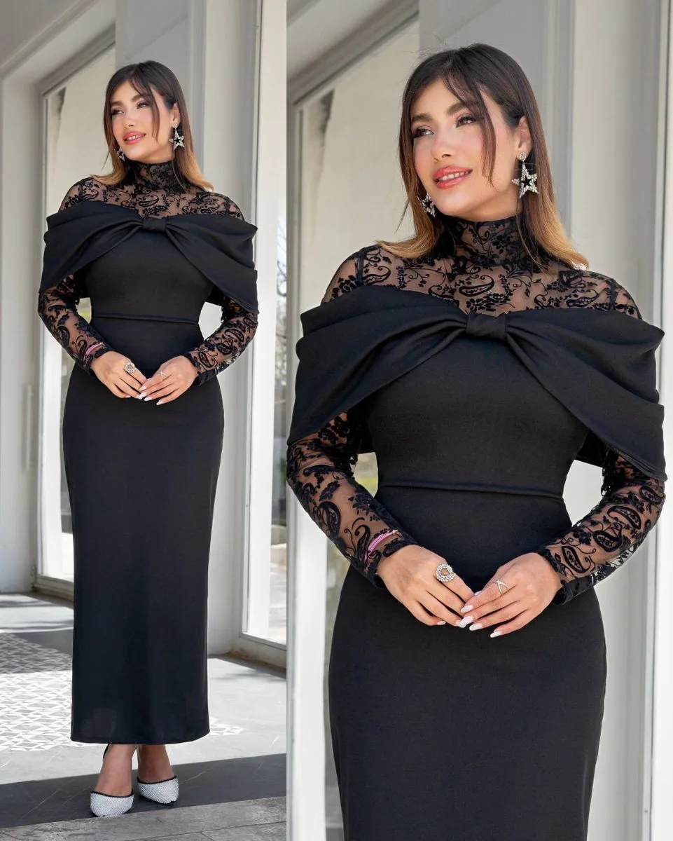 پارچه این مدل دارای خاصیت کشسانی ملایم است که راحتی را برای بانوان در سایزهای مختلف فراهم میسازد. دوخت تمیز و برش اصولی در قسمت کمر و آسترکشی کامل، ساختاری منظم و فرم اندامی و خوشفرم را ایجاد کرده است. رنگ مشکی مات آن با بافت مرواریدی و گیپوری تور فلوک ترکیب شده تا جلوهای بسیار فاخر و مجلسی برای مراسم شب، جشنها و مهمانیهای رسمی ایجاد شود.