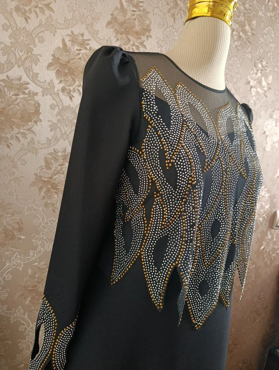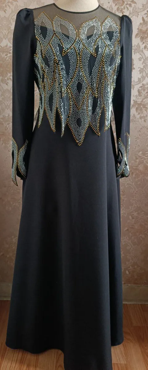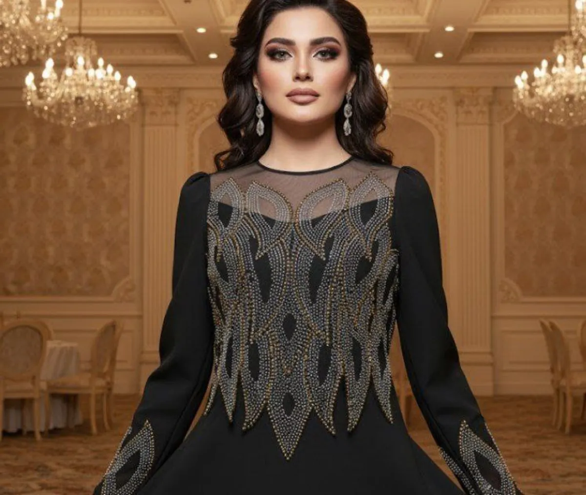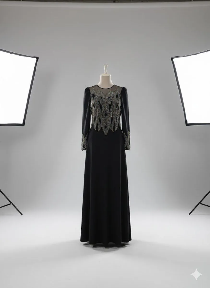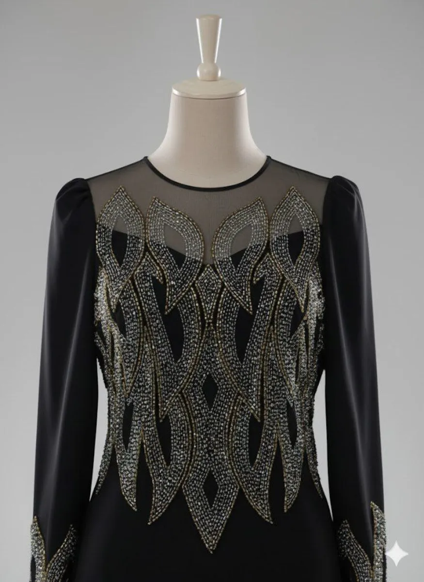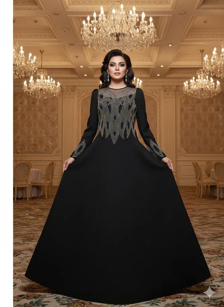 سطح لباس با برشهای لیزری دقیق و نگینهای تضمینی ضدریزش تزئین شده که جلوهای لوکس و درخشان به ظاهر مشکی کلاسیک آن داده است. این طراحی باعث میشود لباس با هر حرکت، نوری ملایم و مجلسی از خود منتشر کند. دوخت تمیز، الگوی اصولی و پوشانندگی بالا، آن را به انتخابی بینقص برای بانوان سایز بزرگ تبدیل کرده است.