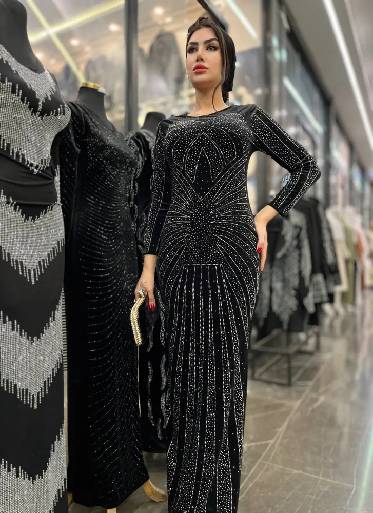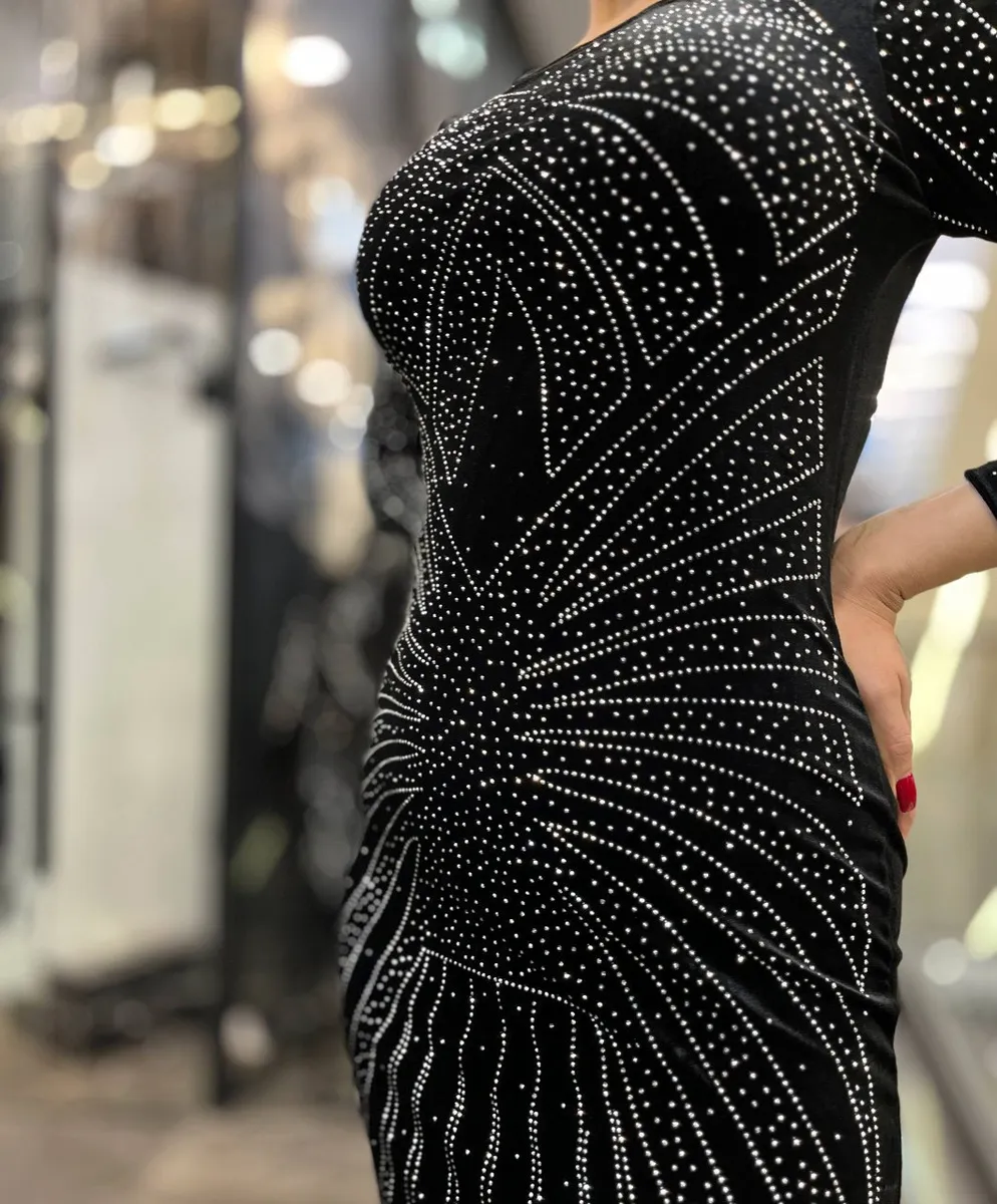 سطح لباس با نگینهای DMC ضدریزش و درخشان تزئین شده است که با هر حرکت، نوری نرم و مجلسی از خود بازتاب میدهند. طراحی ماکسی و قد 150 سانتیمتری، ظاهری کشیده و اندامیتر به استایل میدهد؛ بهویژه در رنگ مشکی کلاسیک که همیشه انتخابی امن و شیک برای مجالس و مهمانیهاست.