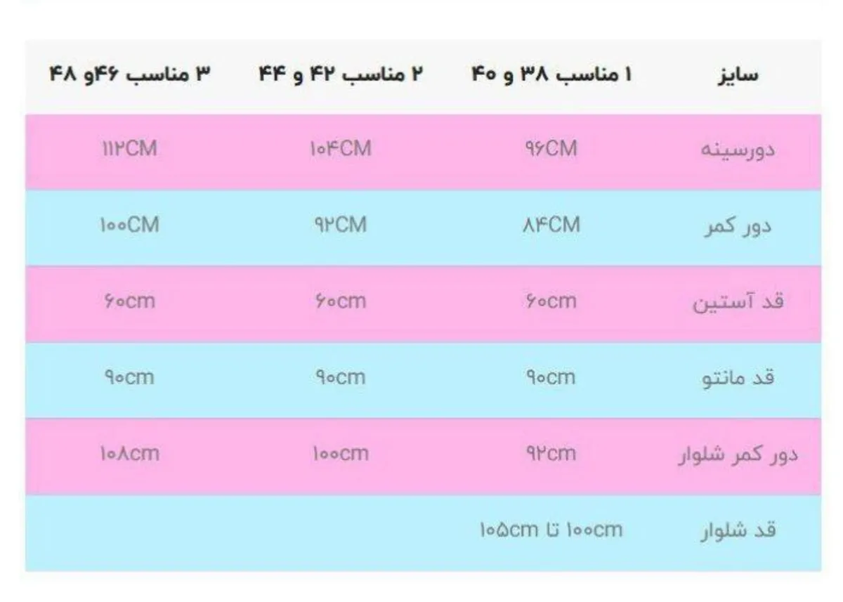 سایزبندی:▫️ سایز 1: مناسب 38–40▫️ سایز 2: مناسب 42–44▫️ سایز 3: مناسب 46–48