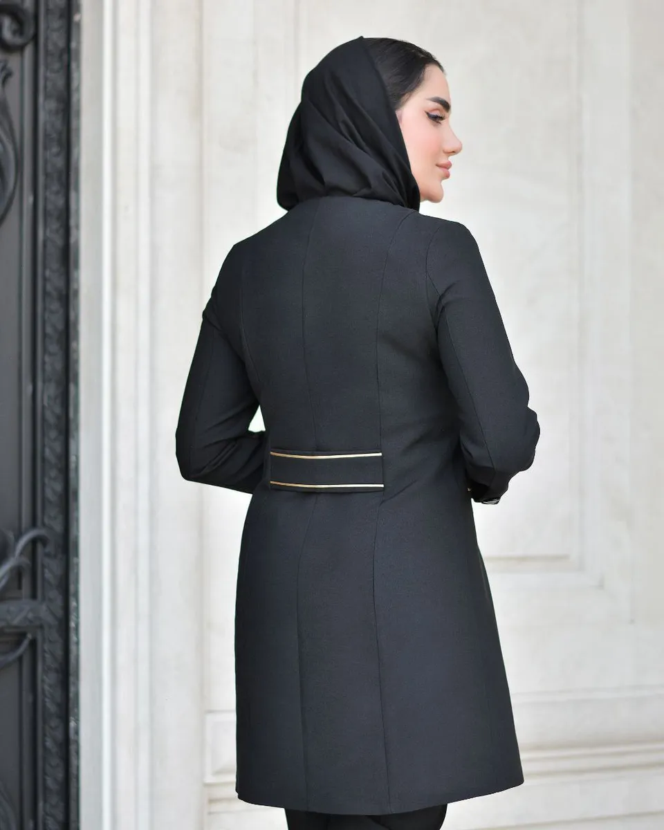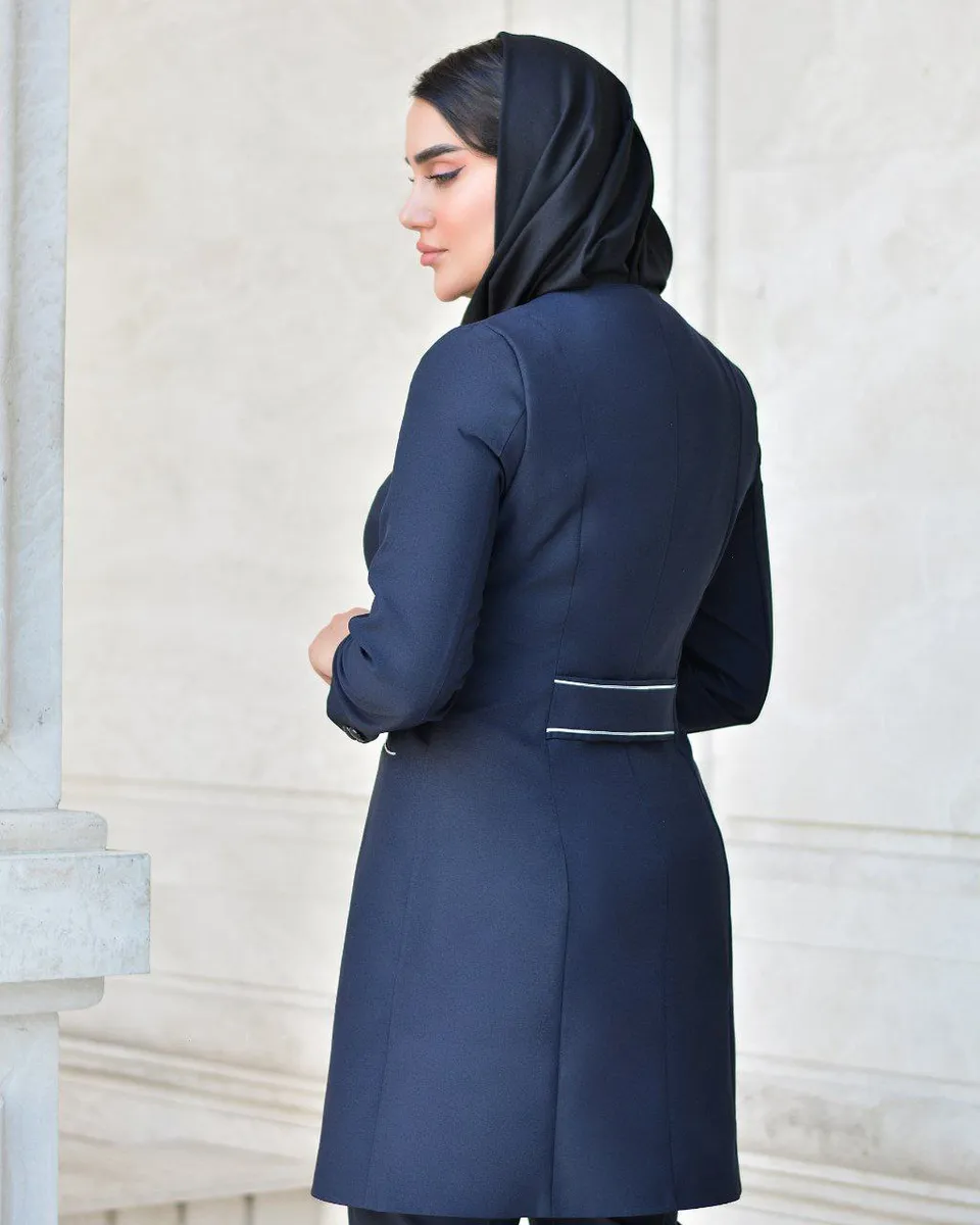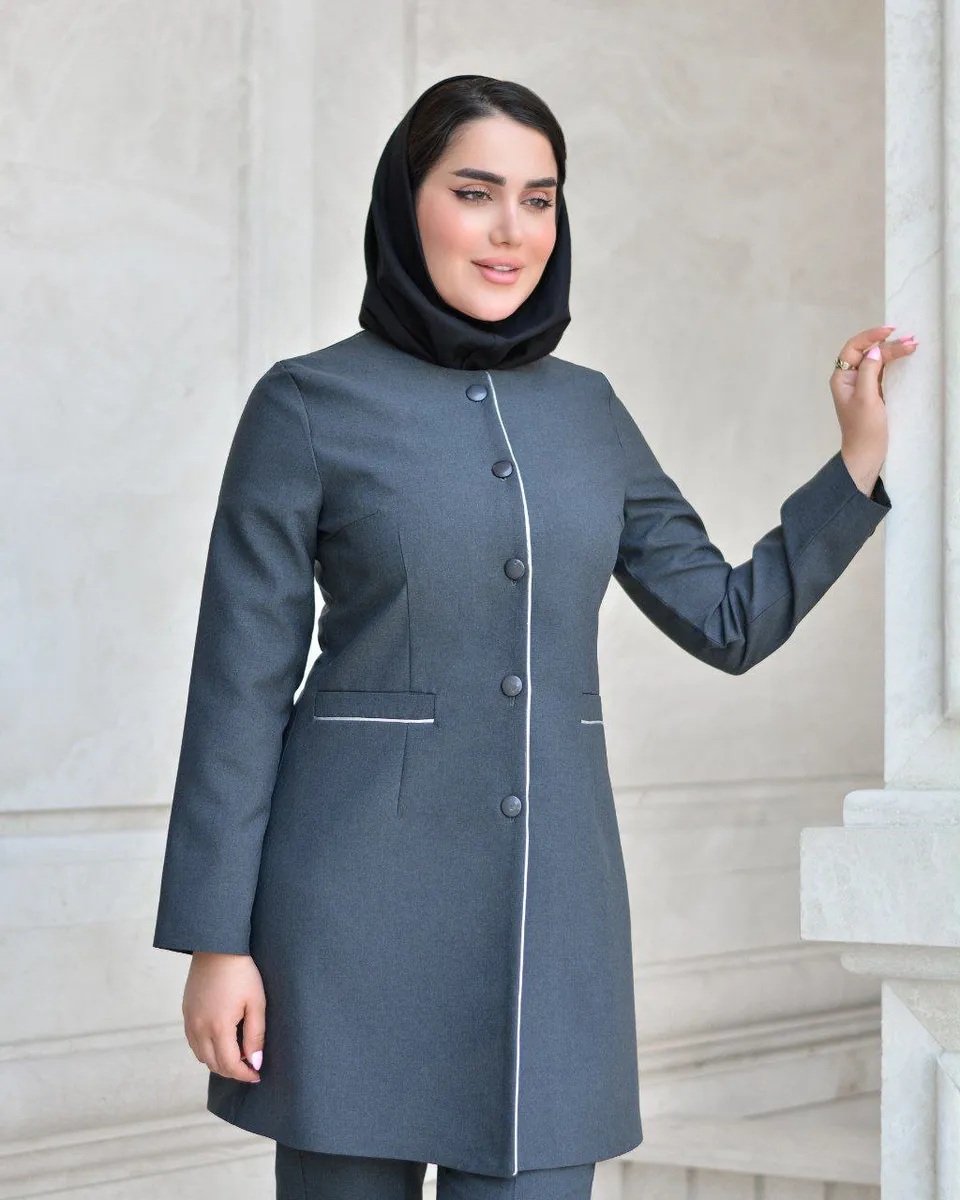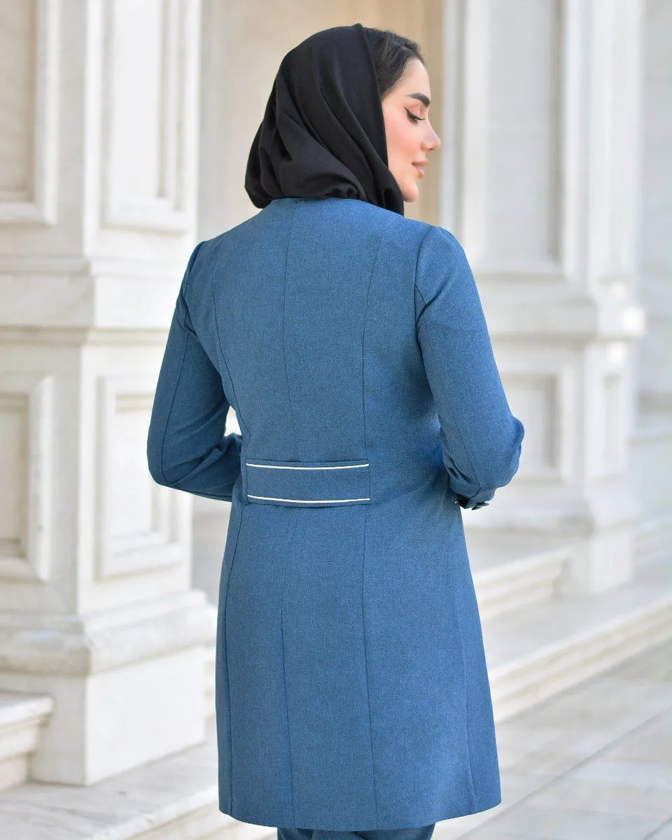 در قسمت جلوی مانتو از لایهکوبی پرشین استفاده شده تا فرم لباس همیشه منظم و خوشساخت بماند. دو جیب واقعی کاربردی برای حفظ امکانات روزمره طراحی شده و مغزیدوزی تمیز در برشها، استایلی رسمی با جزئیات ظریف به مانتو داده است. شلوار ست سولماز نیز دارای کمر زیپ و دکمهدار حرفهای بوده و روی اندام، خوشفرم و ایستا قرار میگیرد.