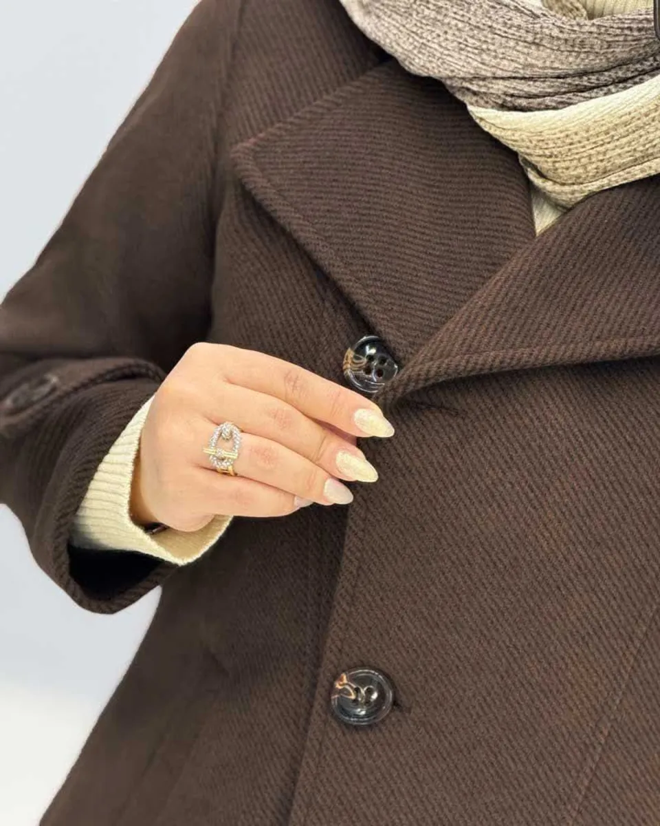 یقهی جذاب **دوحالته (انگلیسی و مردانه)** امکان تغییر استایل به دو فرم مجلسی و اسپرت را فراهم میکند — بسته به اینکه بخواهی آن را باز، نیمهباز یا تاخورده ببندی. **دکمههای جلو و آستین (نما)** جلوهای کلاسیک به پالتو میدهند و دو **جیب کاربردی** در طرفین ظاهر آن را تکمیل کردهاند.
