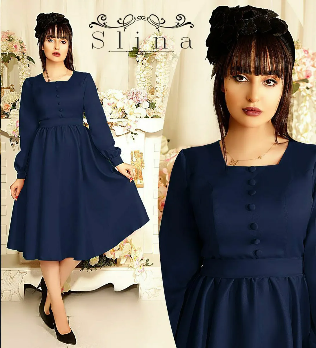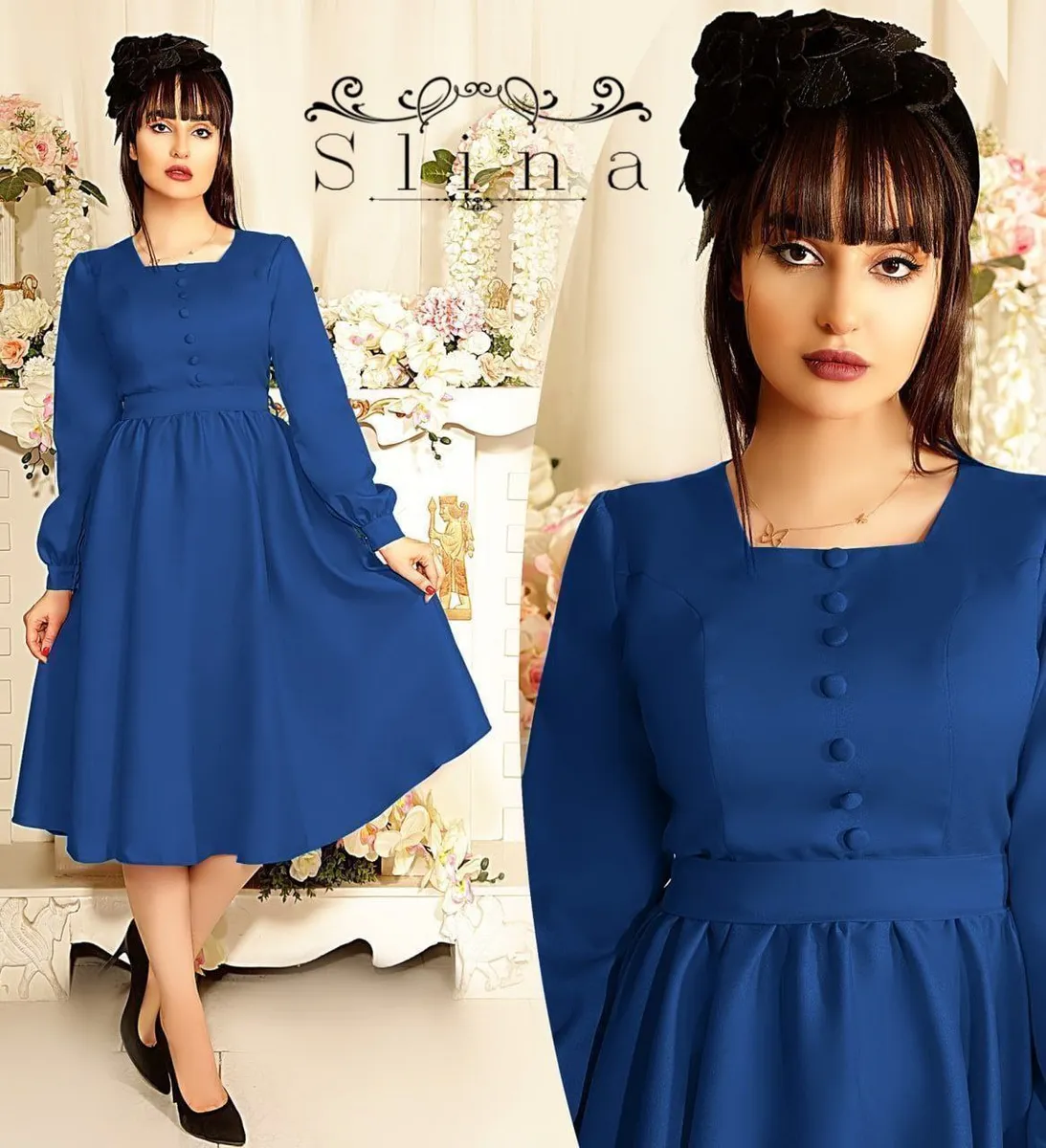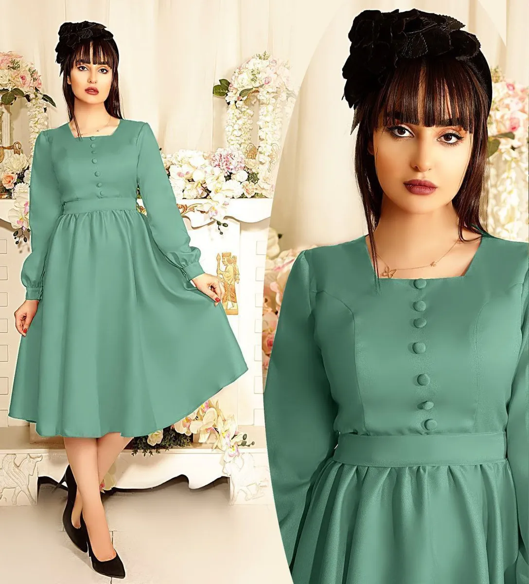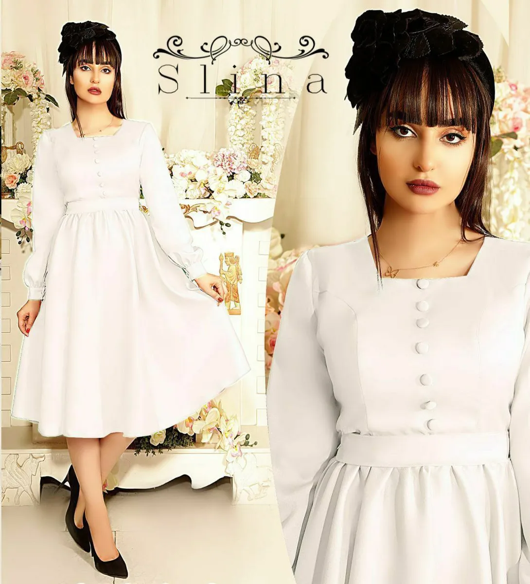 جنس لباس از کرپ اسکاچی باکیفیت است؛ پارچهای لطیف، خوشدوخت و بدون چروک که در عین سبکی، خوشفرم و خوشتن مینشیند. طراحی یقه مربعی و آستینهای بلند با مچ دکمهای جلوهای کلاسیک و شیک به مدل بخشیده و باعث میشود برای مراسم تولد، نامزدی، عقد محضری یا مهمانیهای رسمی انتخابی خاص باشد.