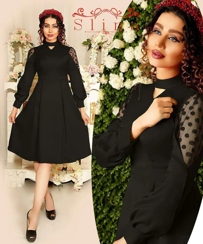 در بخش سرشانه و آستینها از تور یا حریر خالدار توپی باکیفیت بالا استفاده شده که در کنار یقه ایستاده و برش قطرهای ظریف در جلو، جلوهای کاملاً دخترانه و لطیف به لباس میبخشد. دامن فون کلوش، کمربند همجنس و دوخت ظریف آن باعث میشود این مدل برای استایلهای رمانتیک و خاص انتخابی کاملاً دلنشین باشد.