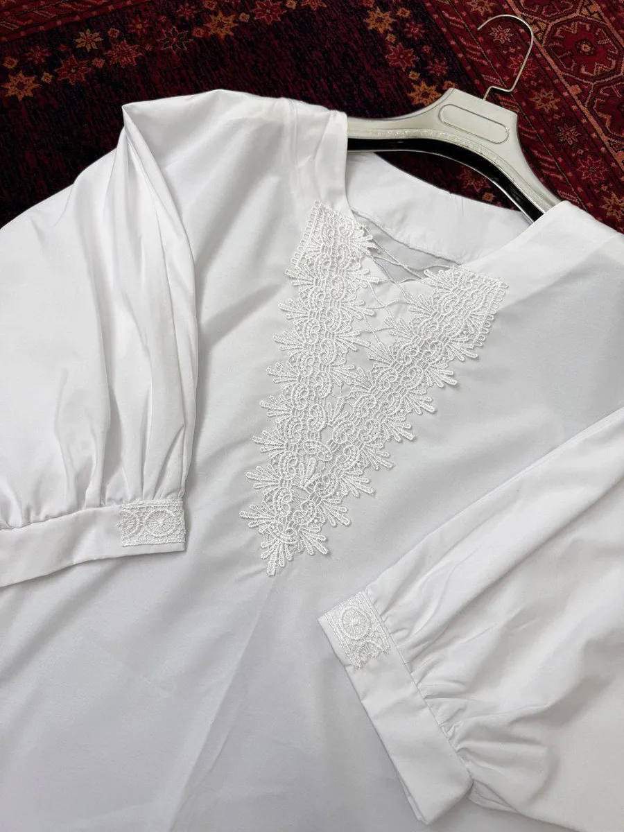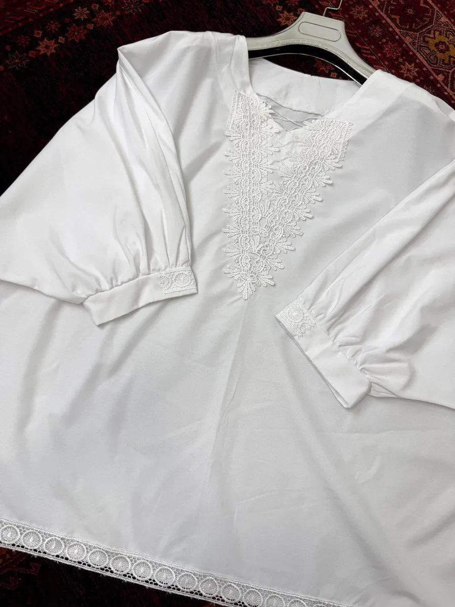 یقه و نوار جلو با خرجکار گیپوری ظریف تزئین شده و زیبایی چشمنوازی به تونیک میبخشد. مدل پشت بلندتر از جلو (قد جلو 71 و پشت 73 سانتیمتر) است که علاوه بر پوشش عالی، جلوهای مدرن و شیک ایجاد میکند. تنخور نرم و راحت این تونیک آن را به انتخابی عالی برای مهمانی، افطاری، جشنهای خانوادگی و استایلهای روزمرهی خاص تبدیل کرده است.