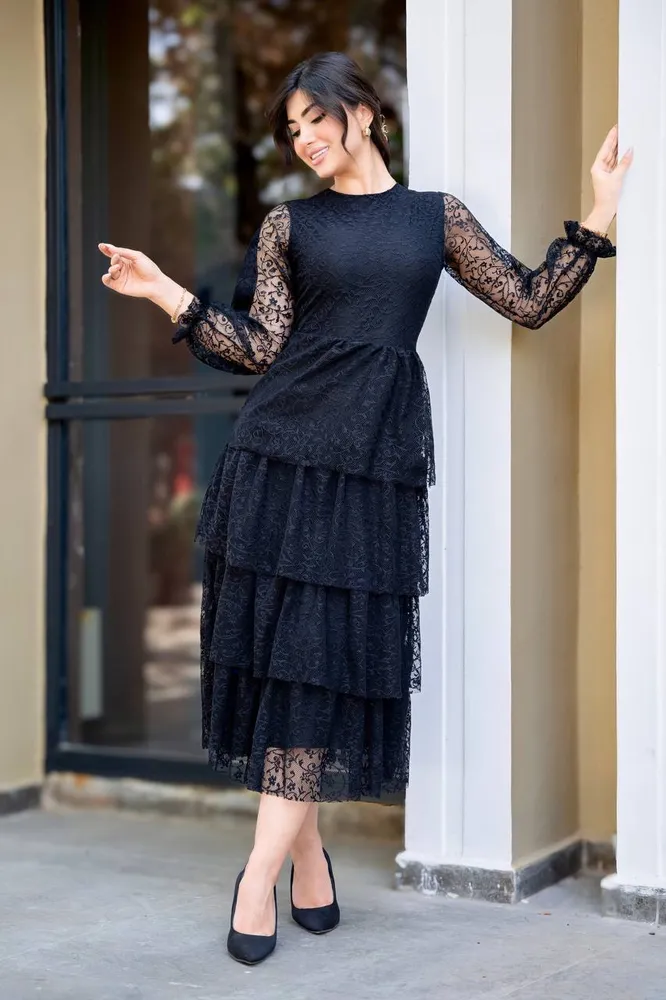 مدل تیلا مشکی جلوهای از لطافت و ظرافت است؛ پیراهنی بلند و چیندار از تور مشکی آستردار که با طراحی عروسکی و پاییندامن فانتزی چیندار، مناسب جشنها و مهمانیهای مجلسی طراحی شده است.