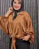 در قسمت جلوی شومیز یک سگک حلقهای جذاب کار شده که جلوهای مدرن و ظریف به لباس بخشیده است. بخش جلویی لباس از زیر دوخته شده تا حجاب کامل و راحتی در پوشش حفظ شود. آستینهای کیمونو آزاد باعث میشود فرم لباس خوشقواره و متناسب با انواع اندامها باشد.