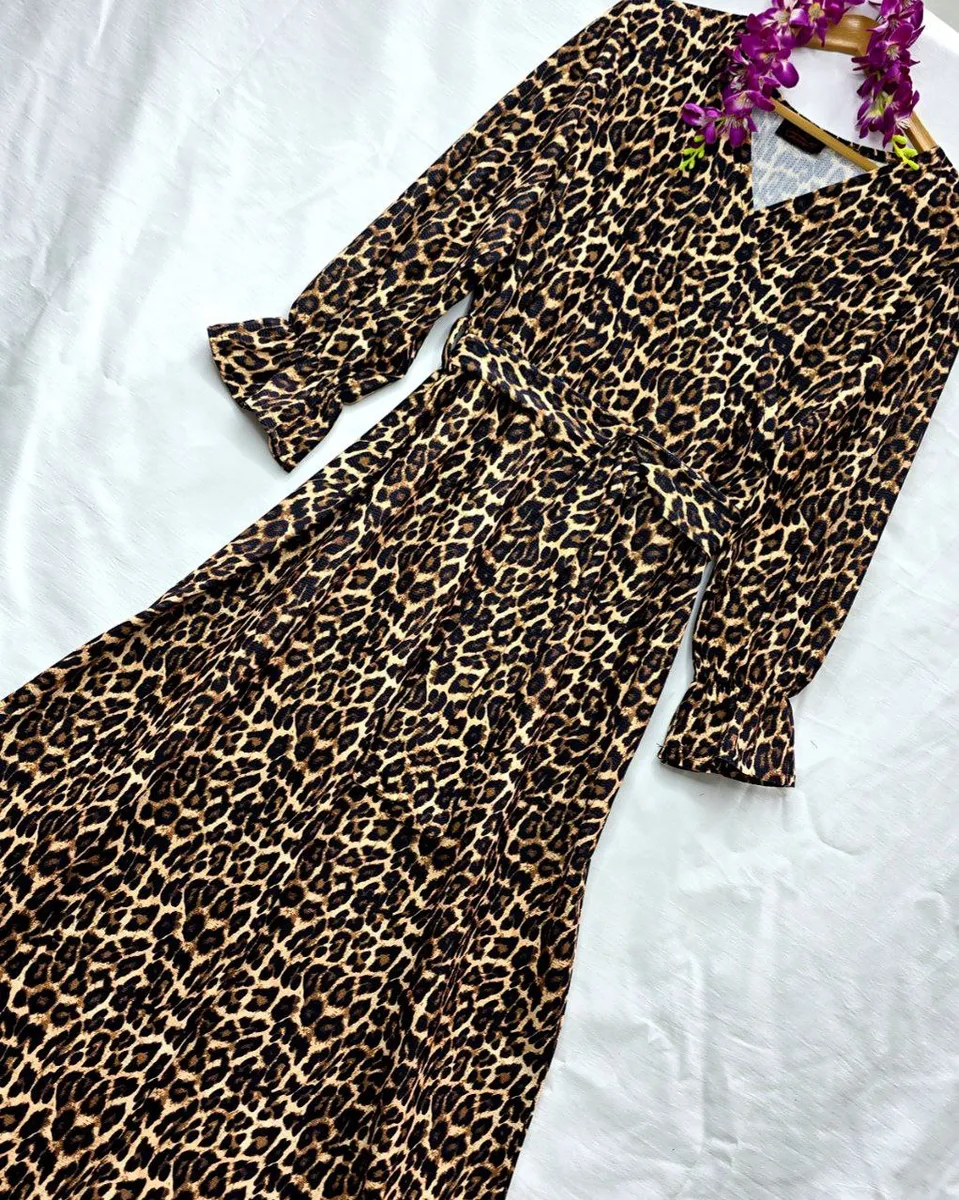 پیراهن ماکسی مهشاد با طرح پلنگی خاص و جذاب، انتخابی جسورانه برای خانمهایی است که دوست دارند در مهمانیها و مجالس بدرخشند. جنس پارچهی کراش باکیفیت علاوه بر لطافت، ایستایی خوبی دارد و هنگام حرکت جلوهای چشمگیر ایجاد میکند.