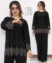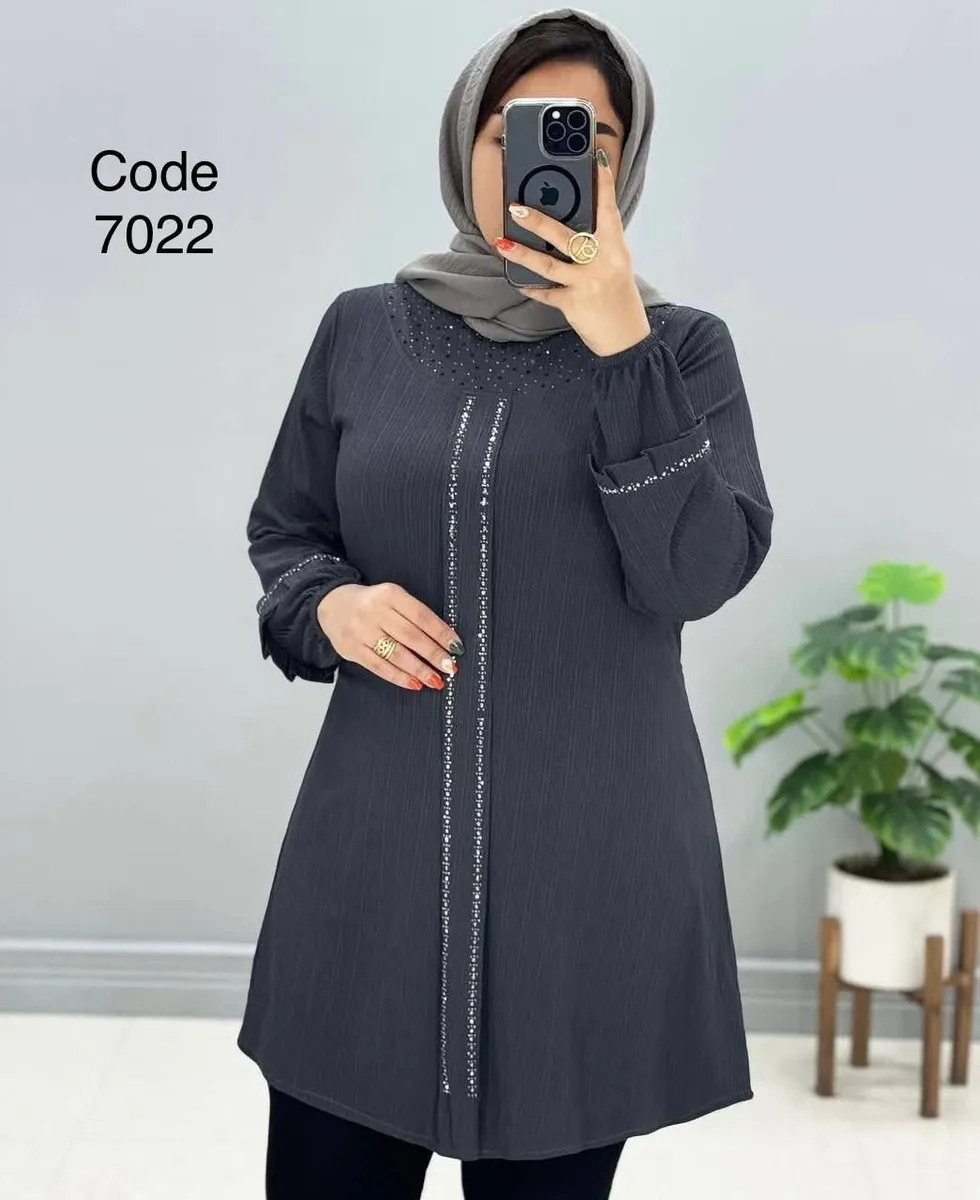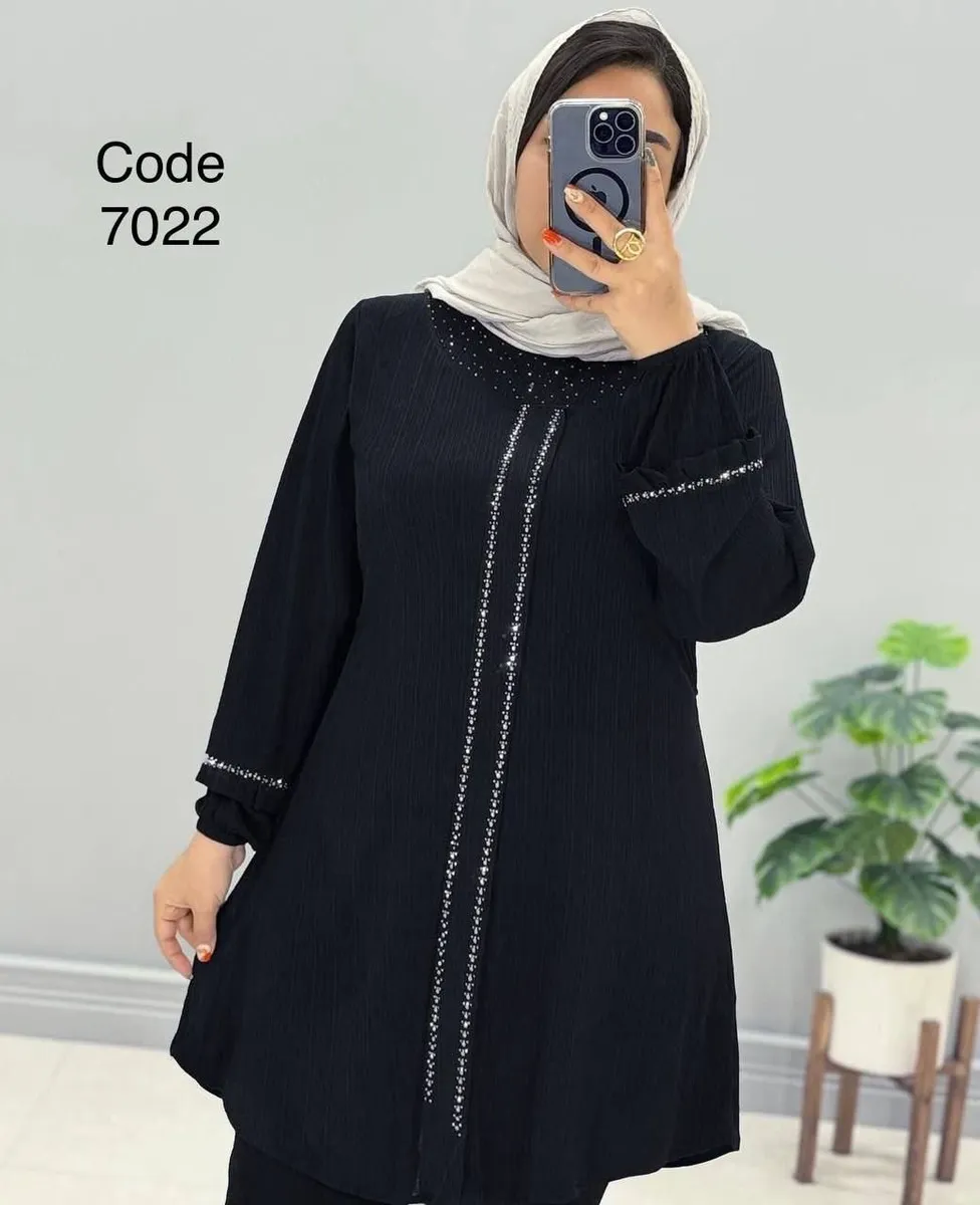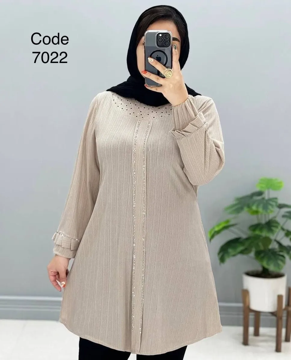 این مدل با قد حدود 90 سانتیمتر، بهصورت بلند طراحی شده و کاملاً پوشیده است تا در کنار شلوار تیره یا لگ، ظاهری متعادل و آراسته بسازد. برش راسته و تنخور آزاد باعث میشود برای سایزهای بزرگ (40 تا 54) بسیار خوشقواره و راحت باشد. جنس خوشدوخت پارچه و نگینهای مقاوم در برابر شستوشو، کیفیت بالای دوخت این مدل را تضمین میکند.
