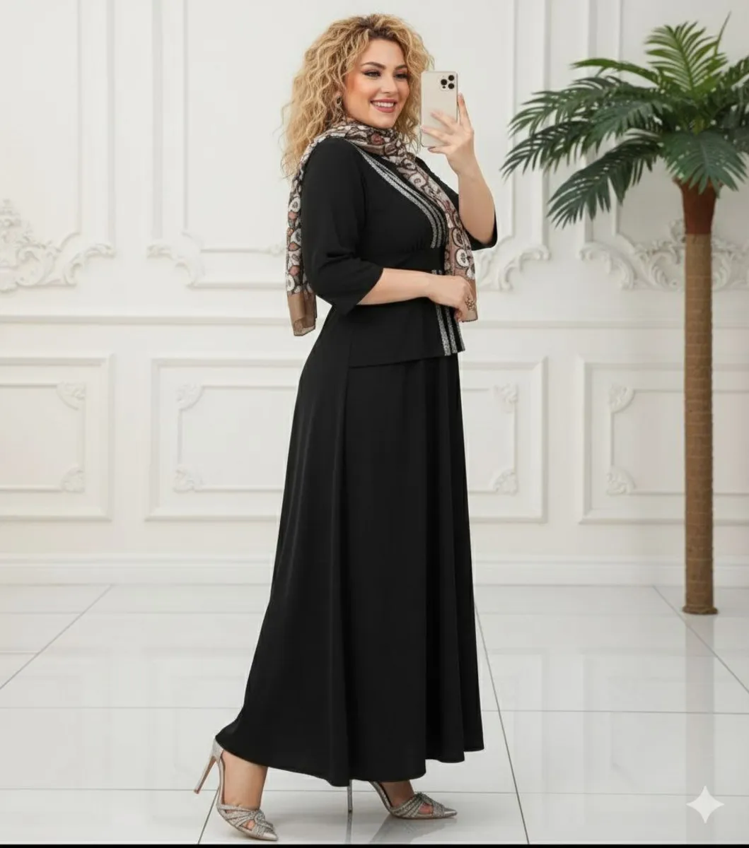 دوخت این پیراهن با دقت مزونی انجام شده و برش آن برای اندامهای سایز بزرگ بهگونهای طراحی شده که همزمان خوشفرم، راحت و پوشیده باشد. پارچه کرپ بافتی لطیف و ایستایی عالی دارد و با طیف رنگ مشکی عمیق، جلوهای خاص و کشیده به اندام میدهد.