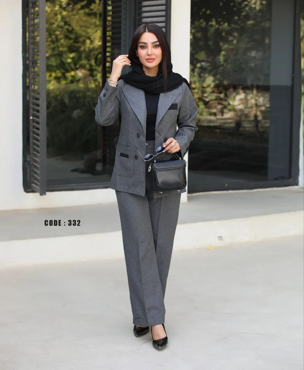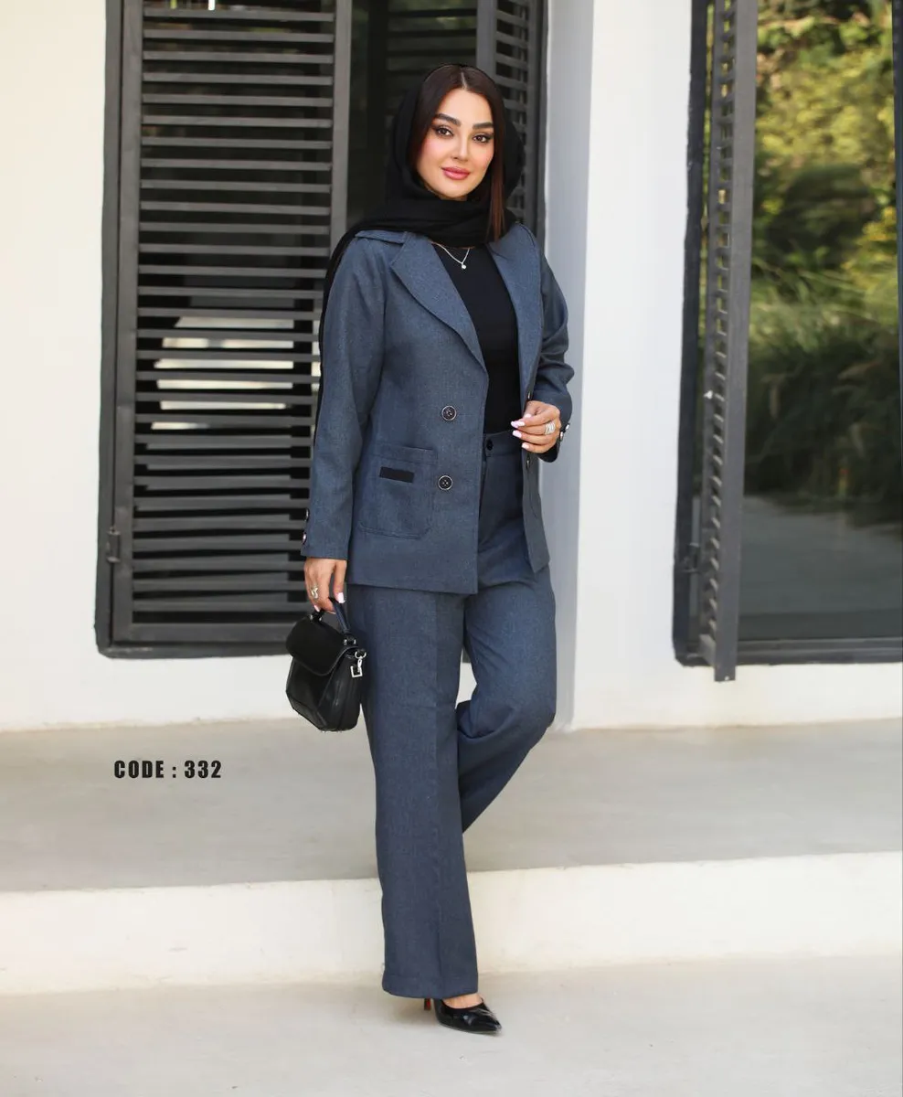 کت این ست بهصورت جلو بسته با قزن طراحی شده و بخش پیشکار آن لاییکوبی شده با پارچه پرشین است تا فرم ایستاده و رسمیتری روی بدن ایجاد کند. شلوار نیز با زیپ در جلو و کش در قسمت پشت کمر دوخته شده تا هم استایل کلاسیک خود را حفظ کرده و هم راحتی بیشتری برای استفاده روزمره فراهم کند.