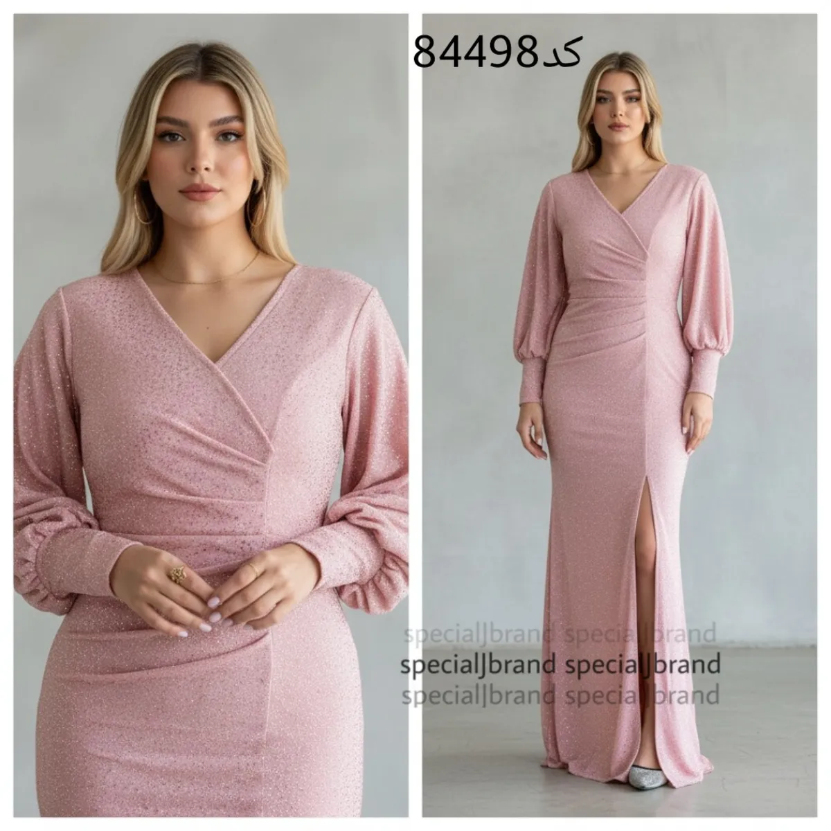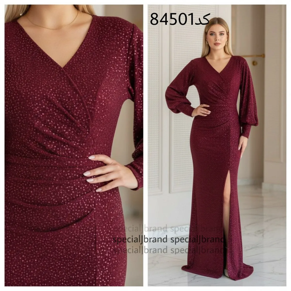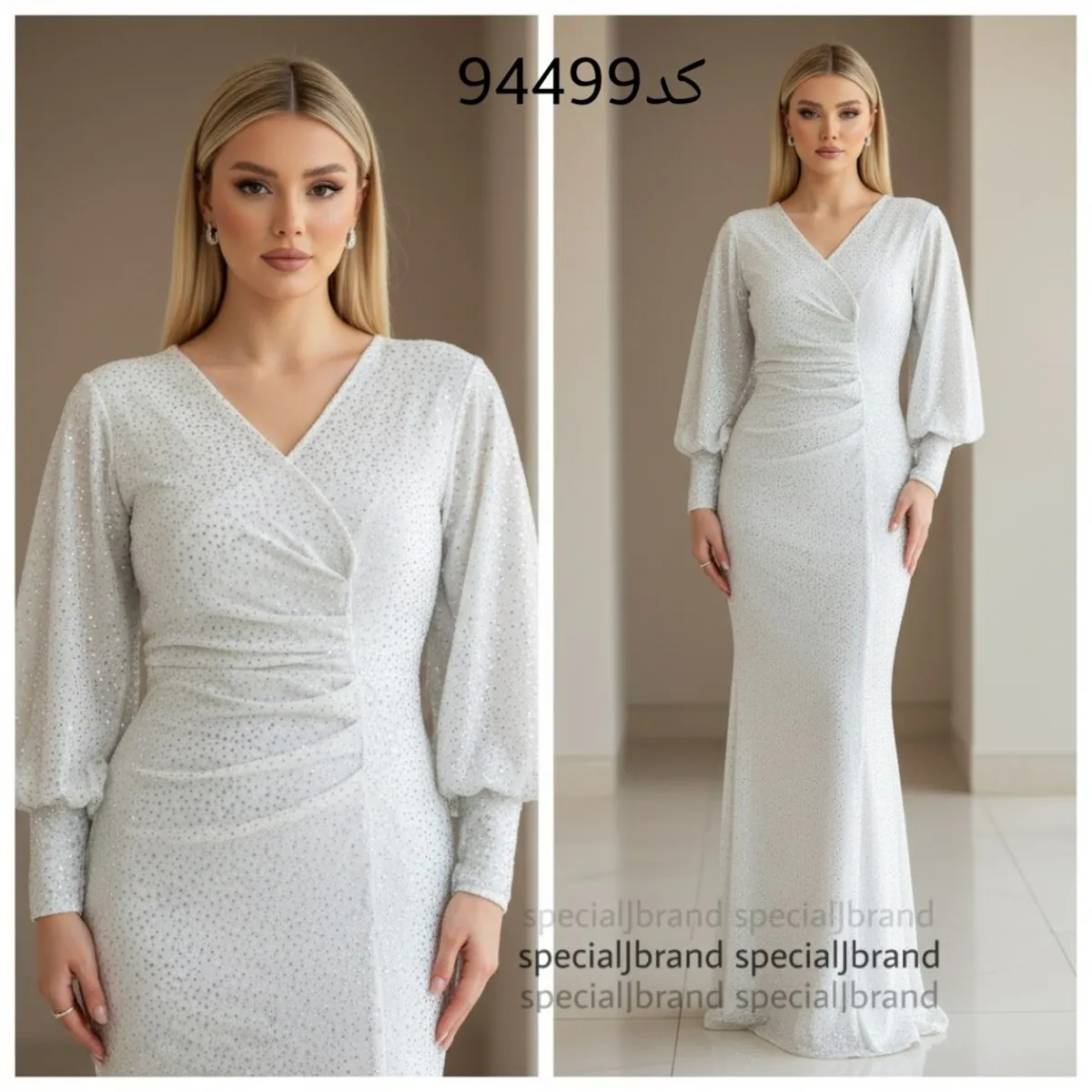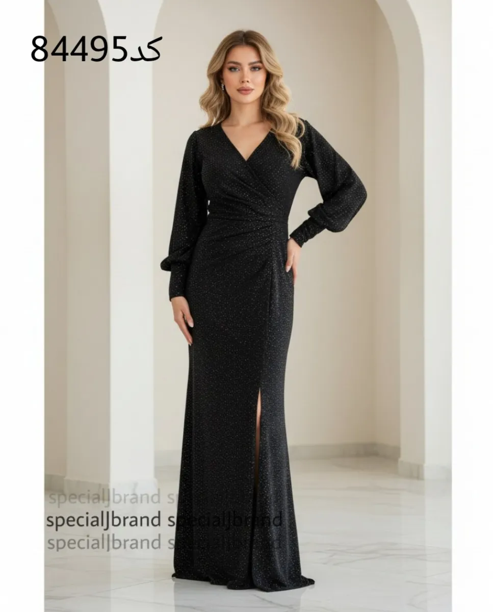 این مدل از **پارچه لمه پولکی براق و اکلیلی** دوخته شده که در نور جلوهای شاین و لوکس دارد. **پشت لباس دارای زیپ مخفی** برای پوشش آسانتر است و **قد کار 160 سانتیمتر با چاک 50 سانتیمتری در یک سمت** طراحی شده تا ترکیبی از وقار و جذابیت را ارائه دهد.