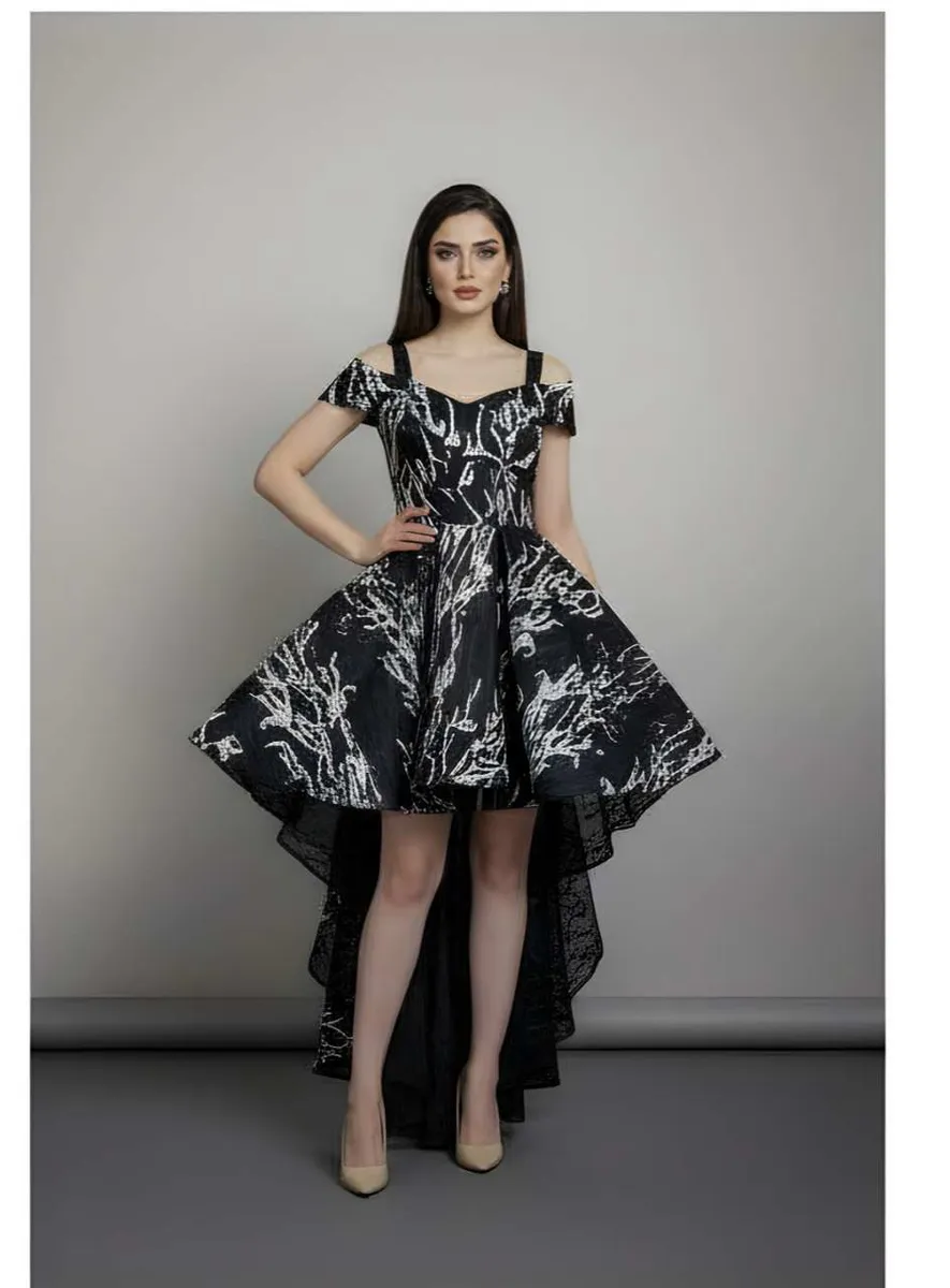 این مدل جذاب، در چهار سایز مختلف S تا XL (36 تا 44) طراحی شده که تضمینکننده فیت استاندارد برای طیف وسیعی از اندامهاست. جلو لباس با قد 82 سانتیمتر زیبایی کوتاه و دخترانه را برجسته میکند، در حالی که دنباله پشت (با قد 140 سانتیمتر) به استایل رسمی و مجلسی لباس شخصیت و شکوهی ویژه میبخشد.
