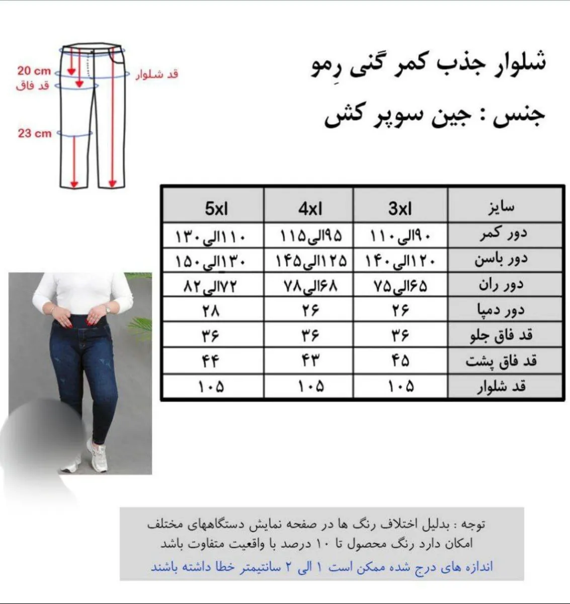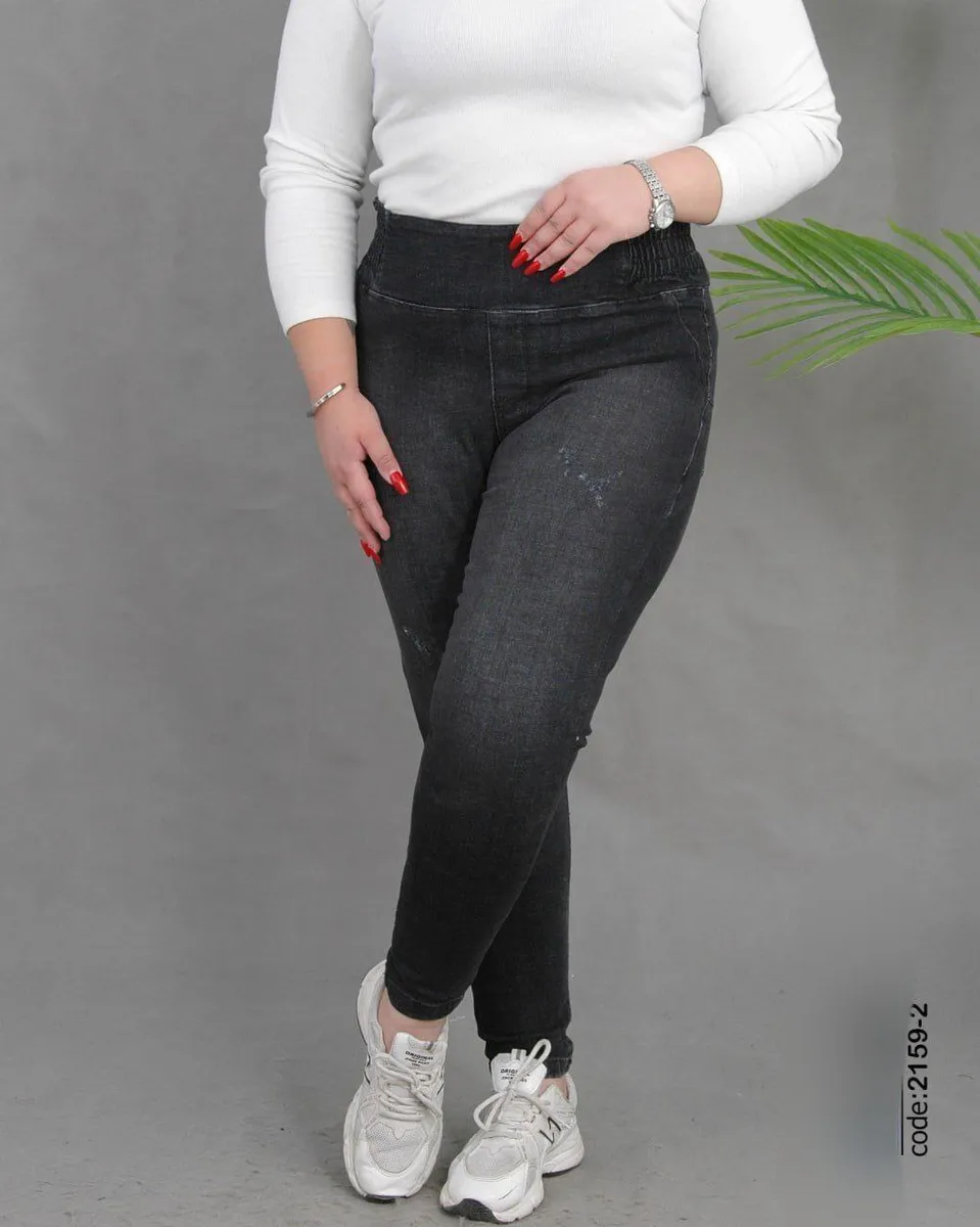 این مدل از جین سوپرکش، با قدرت کشسانی بالا، تناسب کامل روی اندامهای سایز بزرگ را فراهم میکند؛ با قد 105 سانتیمتر و طراحی جذب، فرم پاها را کشیدهتر نشان داده و زیبایی خاصی به استایل روزمره یا دورهمیهای دوستانه میبخشد.