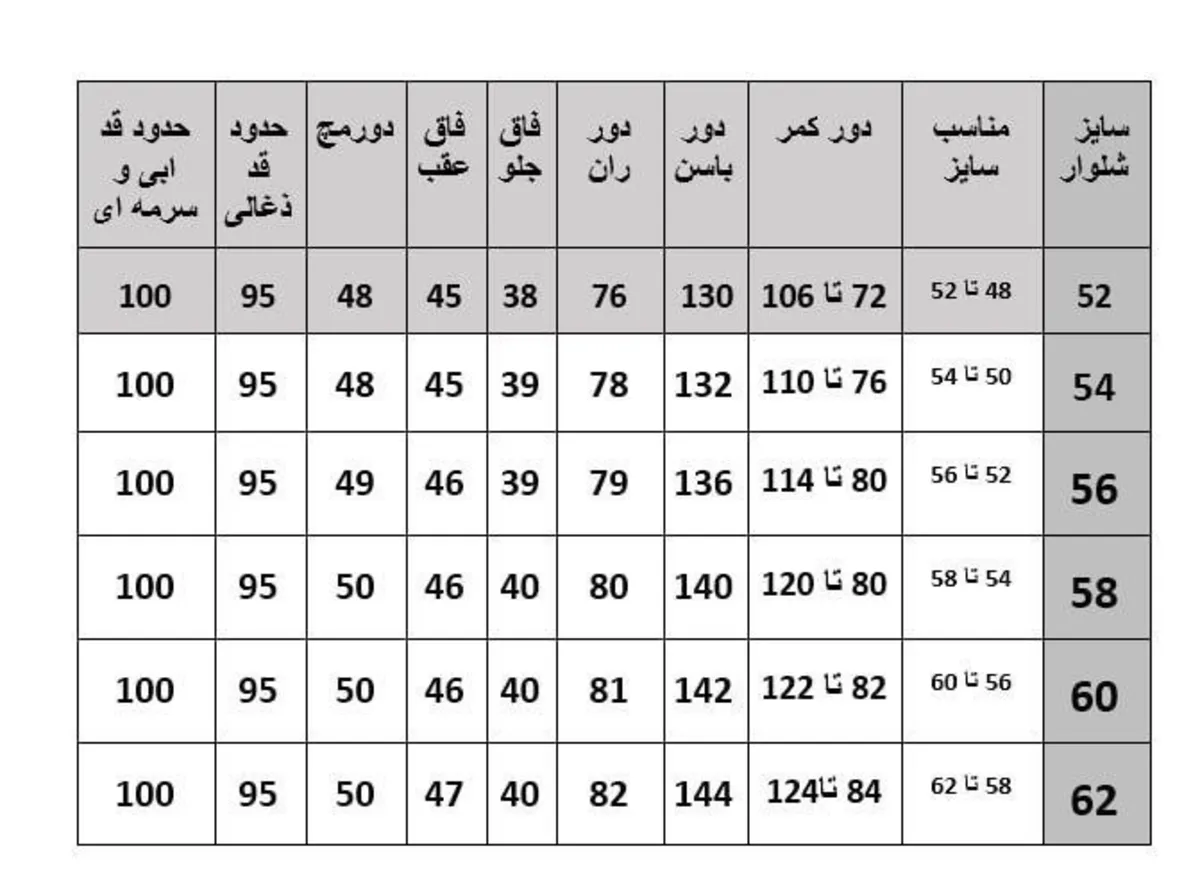 جدول سایزبندی تخصصی (52 تا 60)، خیال مشتریان پلاسسایز را بابت پیدا کردن سایز مناسب کاملاً راحت میکند و ضمانت کیفیت و ارسال مطمئن مزون مودینو، تجربهای لذتبخش و بدون استرس را در خرید آنلاین فراهم میسازد