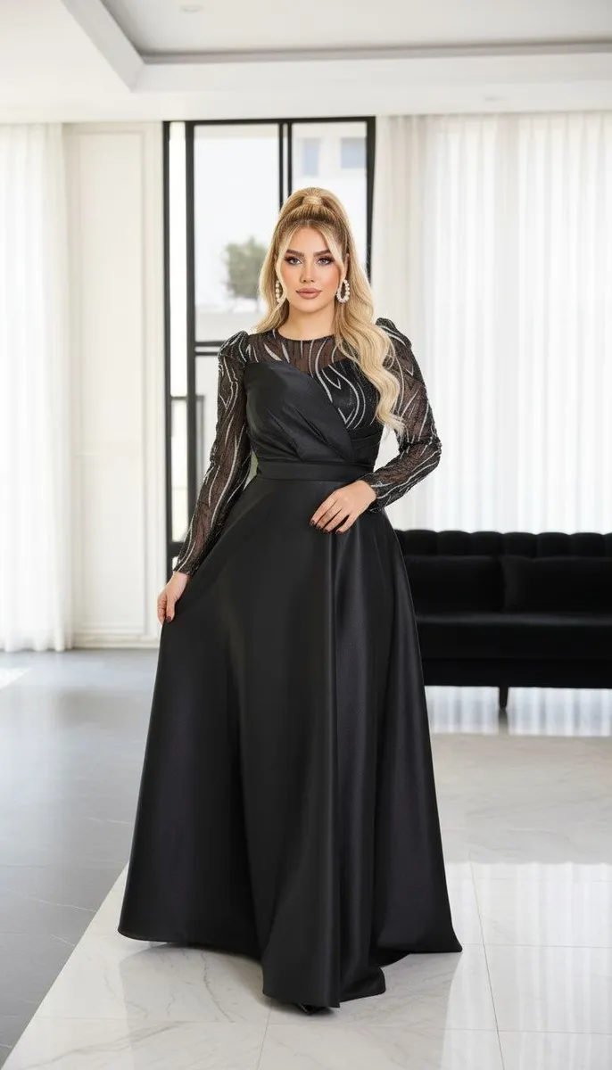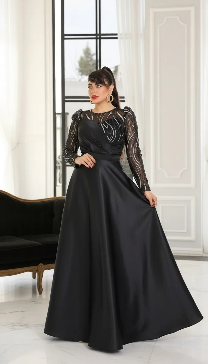 آستین بلند حریر، دامن کلوش ساتن و برش خاص بالاتنه، دیبا را به یک لباس مجلسی بیرقیب برای سایز بزرگ و علاقهمندان به استایل مزونی تبدیل کرده است.