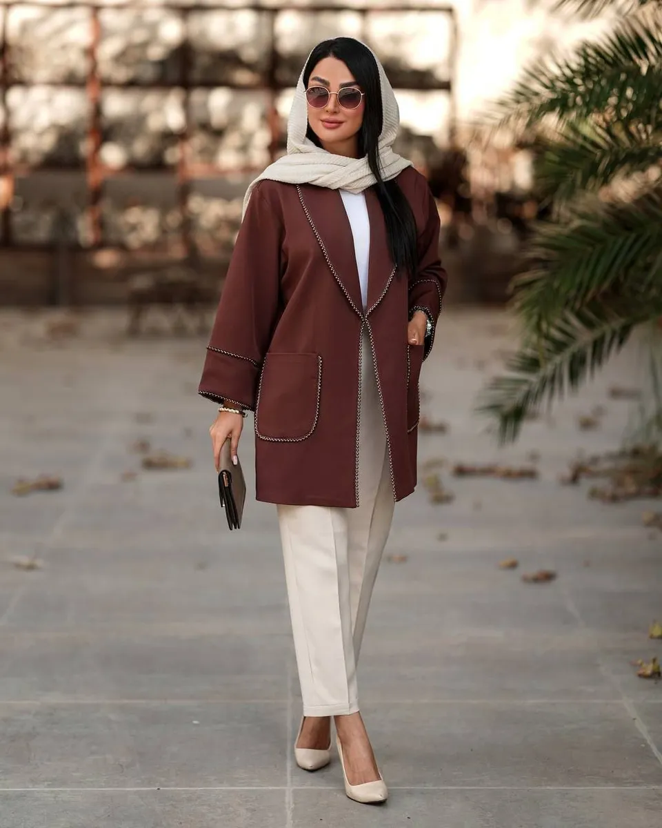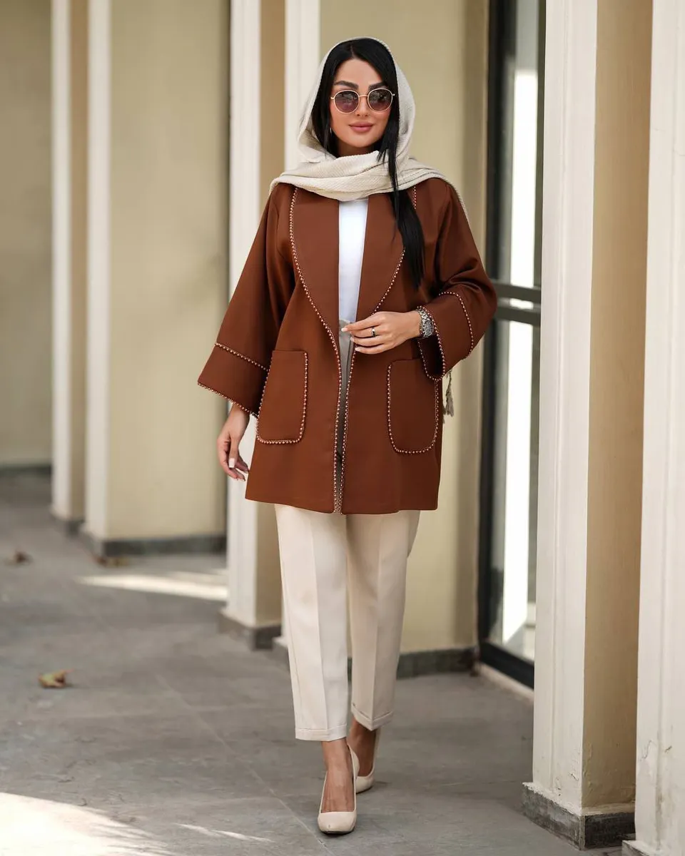 دو جیب کاربردی، فرم کت را کاربردیتر کرده و رنگبندی سهگانه (شکلاتی، مشکی، قهوهای) استایل ویژهای به کل کالکشن پاییزه مودینو بخشیده.