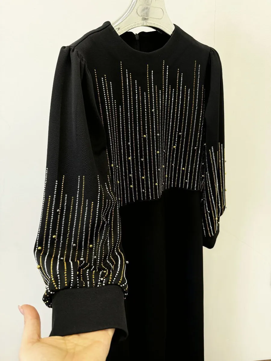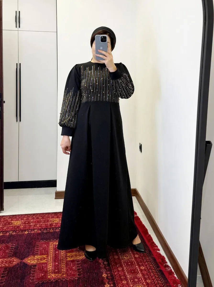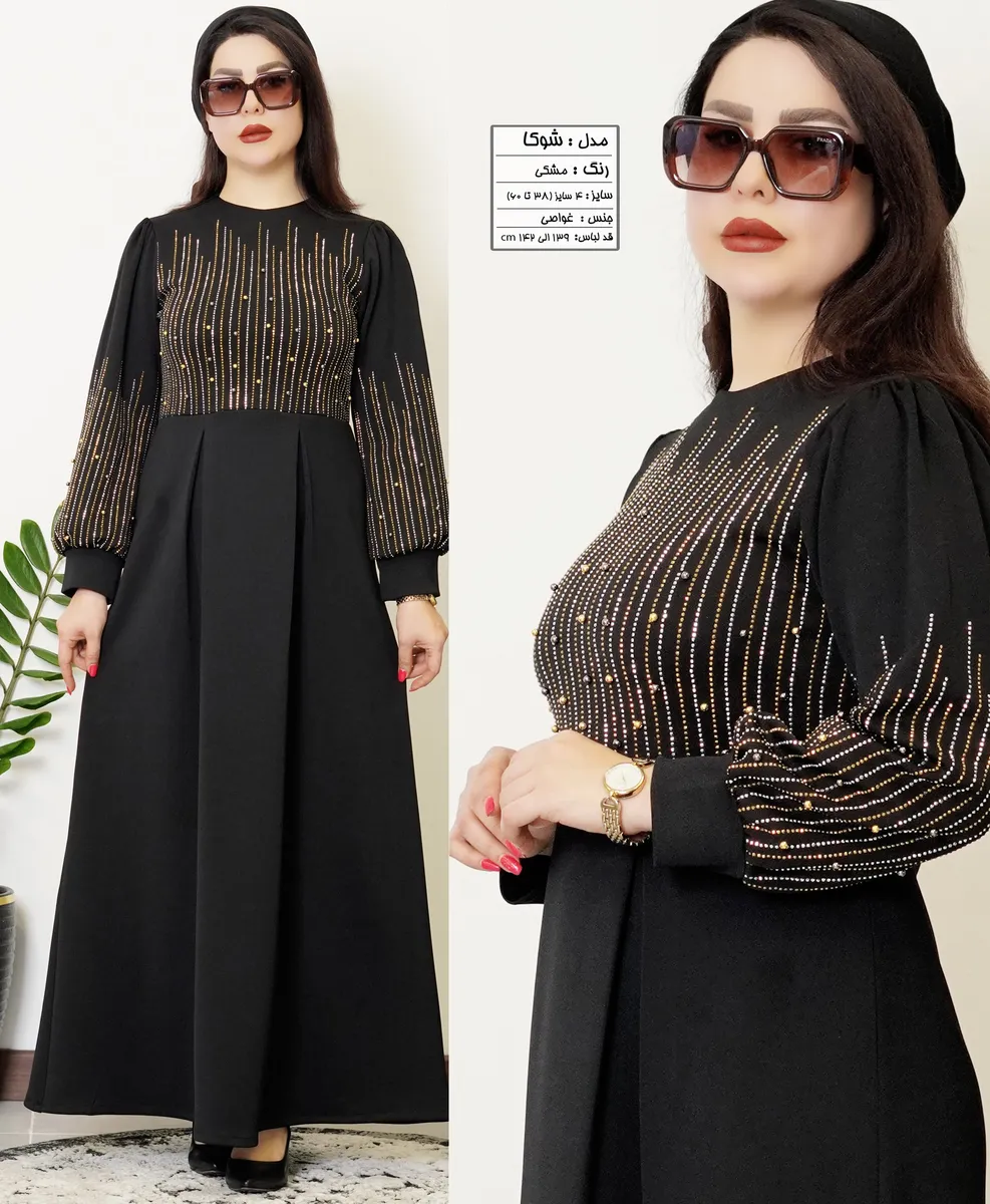 این مدل با **جنس غواصی لطیف با قابلیت کشسانی ملایم**، راحتی، دوام و تنخور عالی را حتی برای سایز بزرگها تضمین میکند. **رنگ مشکی عمیق** با نگین براق و مروارید پانچی به صورت خرجکار ظریف روی لباس، جلوهای چشمنواز و شیک به استایل شما میبخشد.