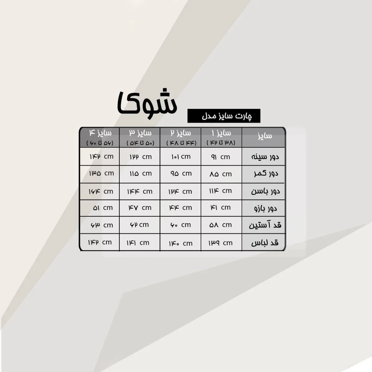 سایز ها : سایز چهار 56 تا 60, سایز دو 44 تا 48, سایز سه 50 تا 54, سایز یک 38 تا 42