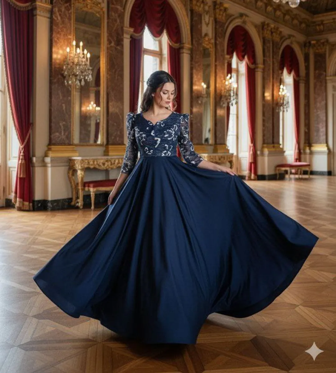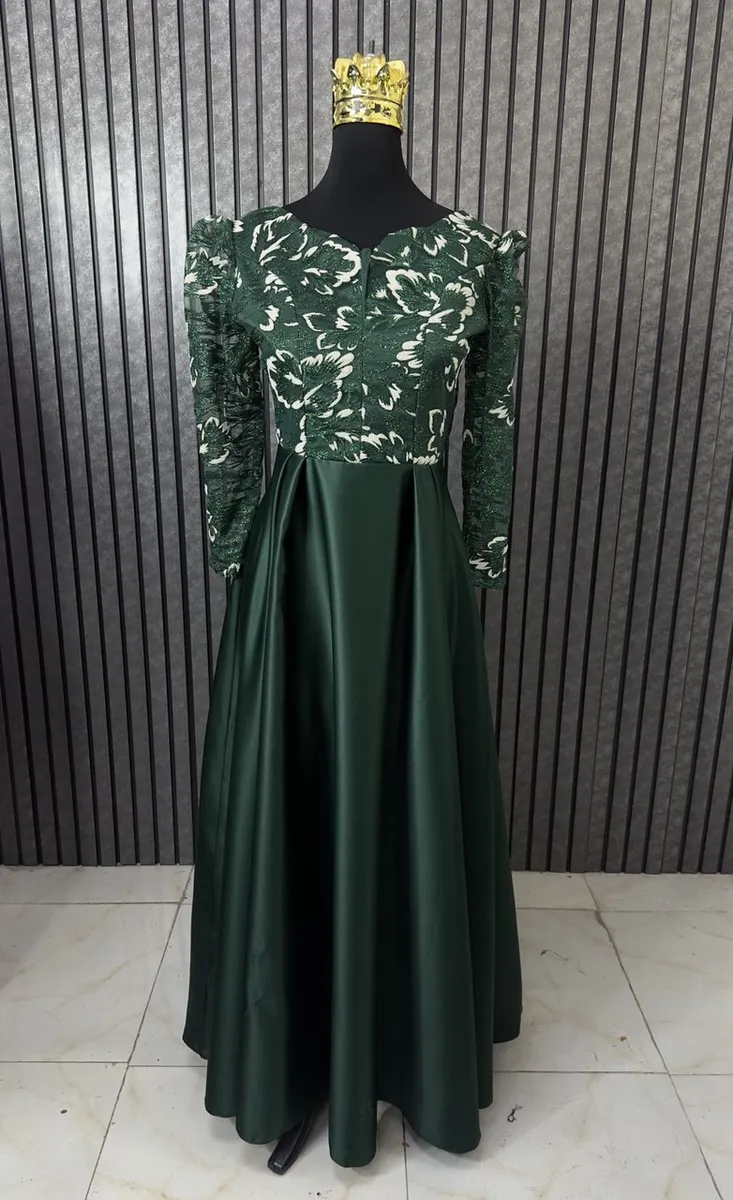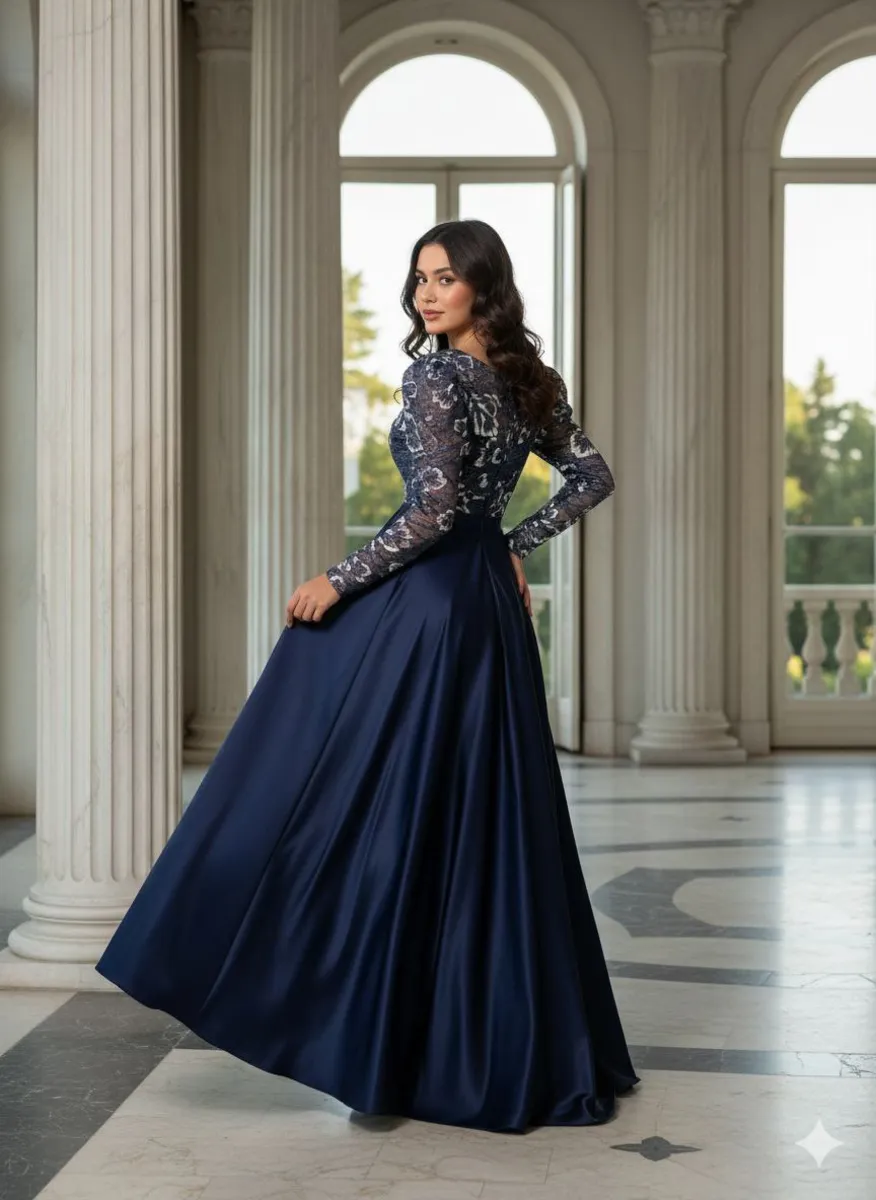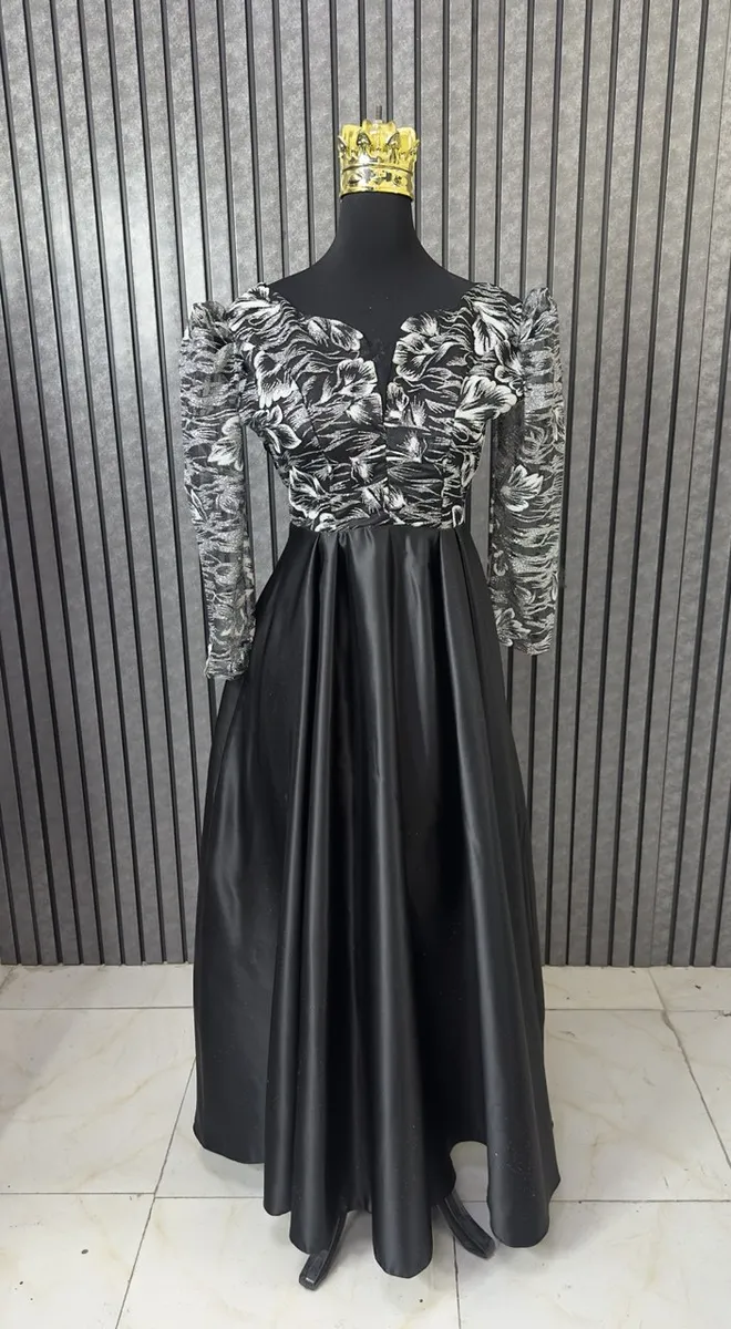 لباس مجلسی فروغ با ترکیب هنرمندانه تور شاین مرواریدی در بالاتنه و دامن کلوش ساتن، تلفیقی بینظیر از سنت و مدرنیته است. بالاتنه درخشان با مرواریدهای ظریف، جلوهای شاهانه و رویایی به شما میبخشد.