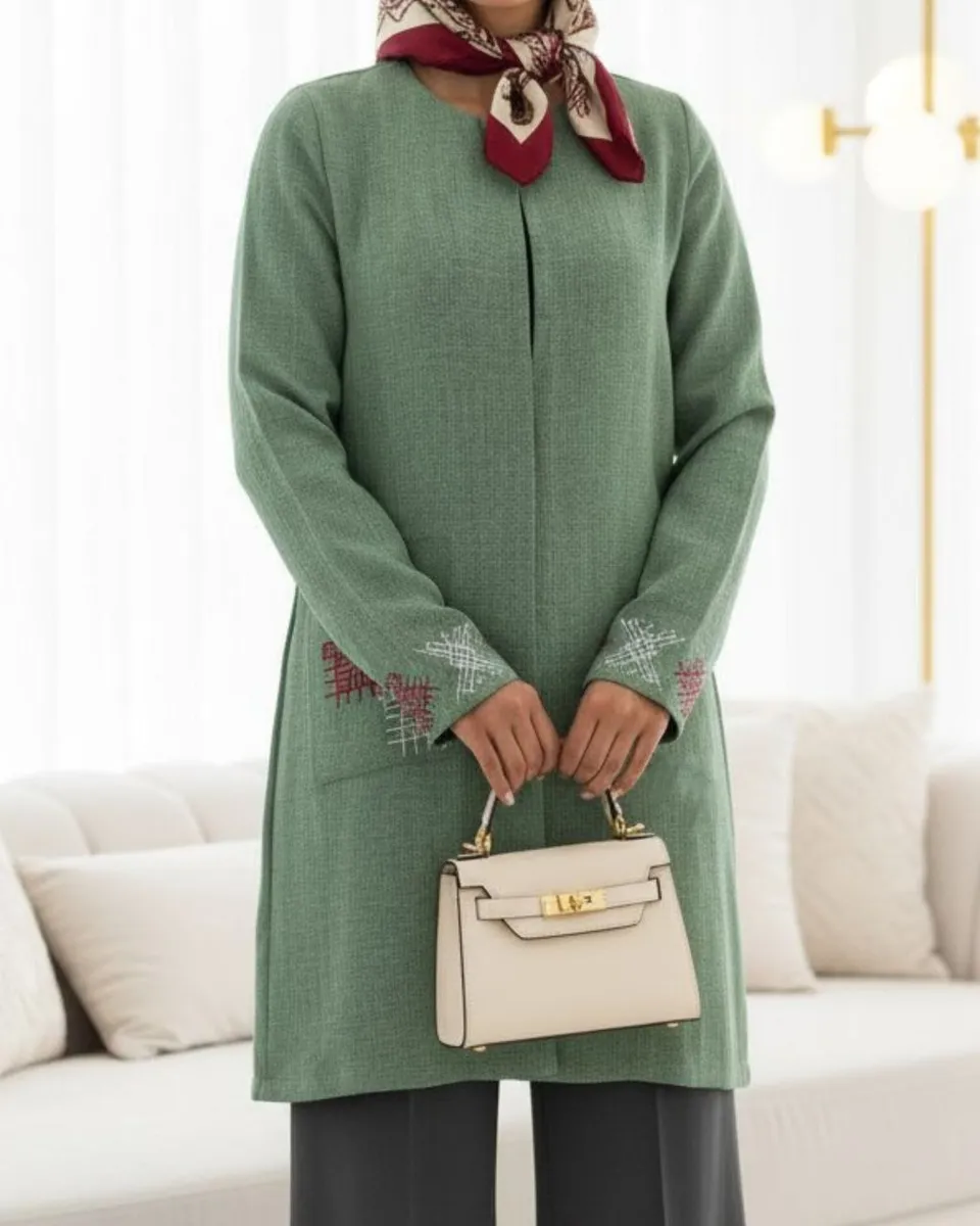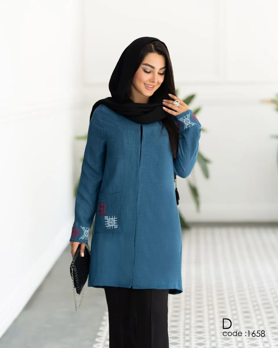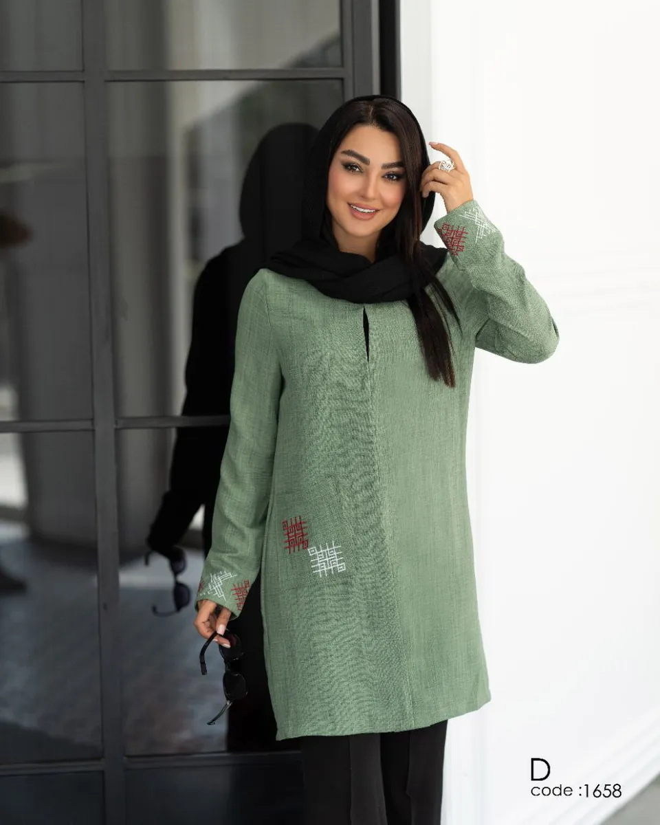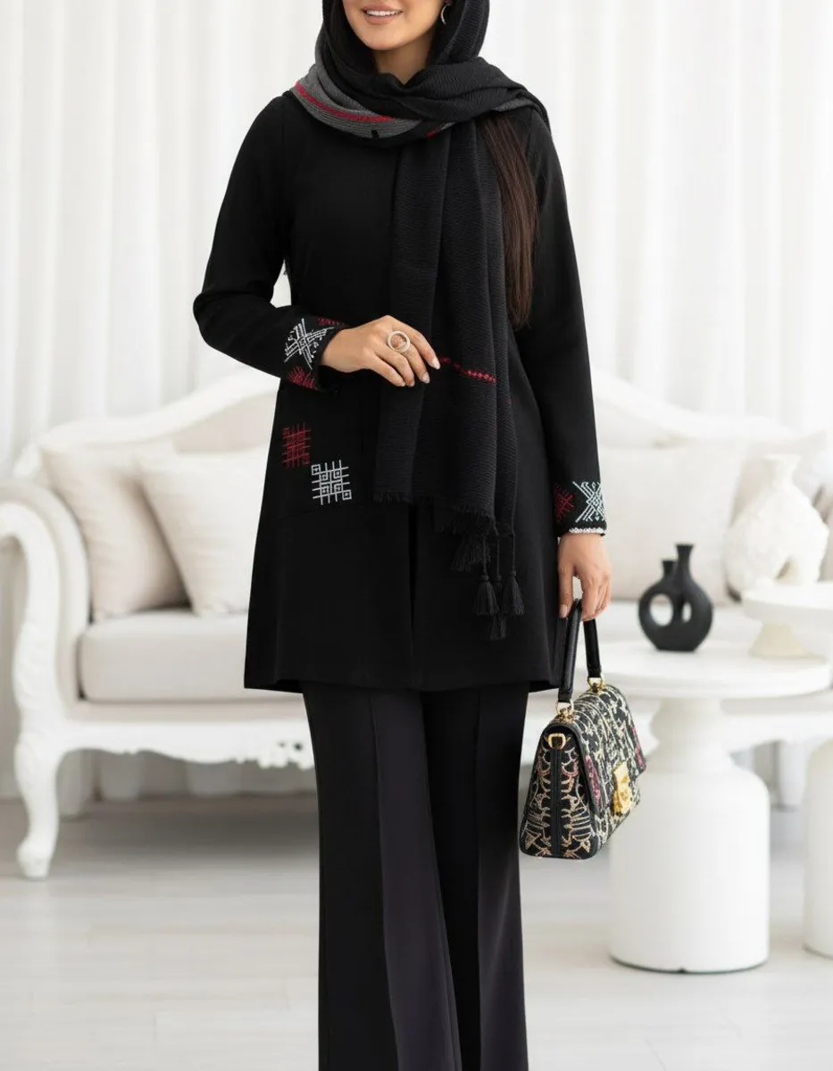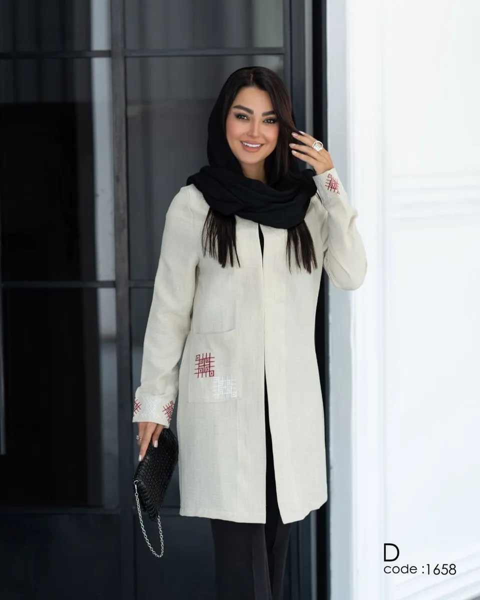 * **جزئیات ظریف و هنرمندانه:** طراحی این مدل با **گلدوزیهای ظریف و هنرمندانه**، سادگی آن را به یک اثر هنری پوشیدنی تبدیل کرده است. این جزئیات، ضمن حفظ کاربری روزمره، جلوهای **مجلسی** و خاص به مانتو بخشیده و آن را از مدلهای مشابه متمایز میکند. قد **کوتاه** و مدرن (92 سانتیمتر) آن نیز به راحتی با انواع شلوار ست میشود و استایلی جوانپسند و جذاب میسازد.